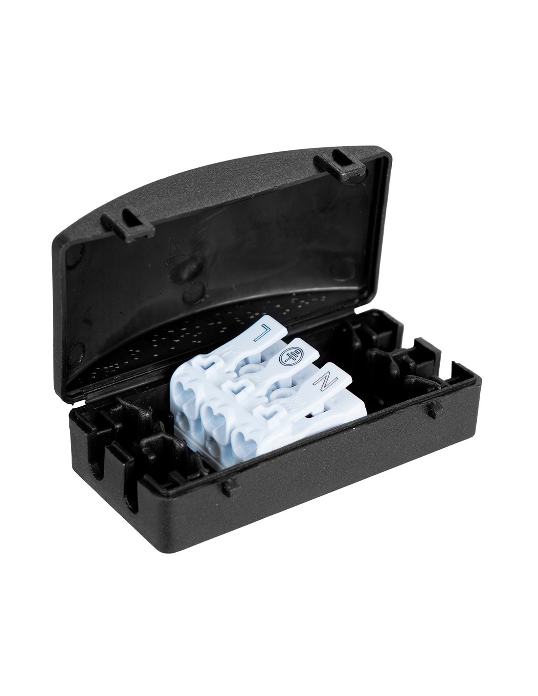 Caja de conexion para iluminacion ip20 black series. 16a, 450vac. t100. terminal 3p seccion 0,5 - 2,5mm. para cable de 4-5mm. dimensiones 73x27x32mm gwt 650°c solera (retractilado) bk-l3p