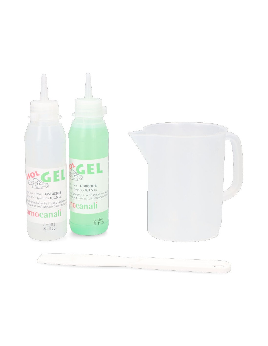 Isogel bicomponente aislante y sellante. gel en formato de 2 frascos de 150g. (300g.) 1 garrafa o recipiente graduado y 1 espátula.