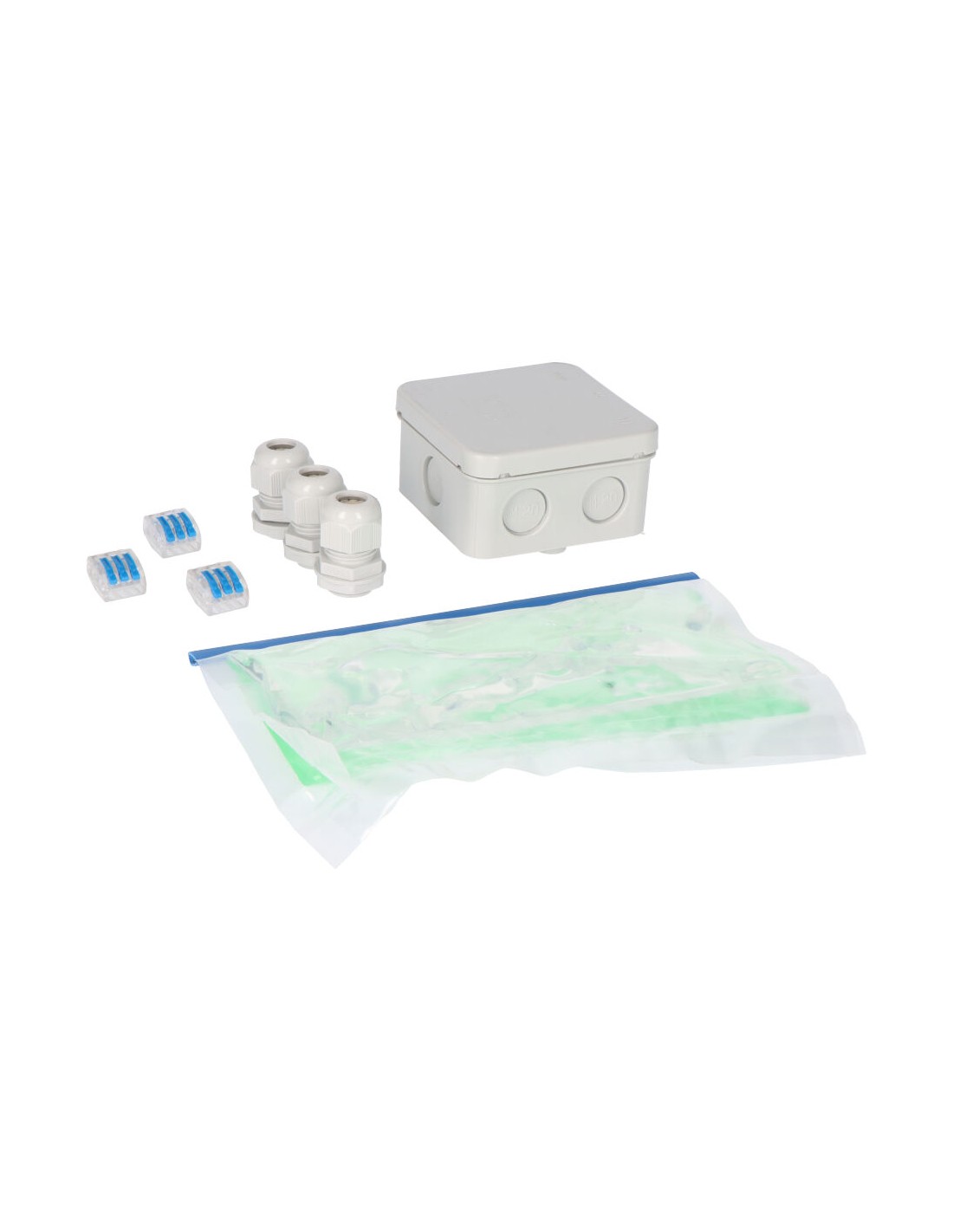 Isolkit aislante y sellante con caja derivación 80mm . composición: 1 bolsa de gel aislante y sellante,3 prensaestopas m20 para cables ø11/17mm, 3 conectores de empalme 4mm y 1 caja de derivación 80x80x40mm