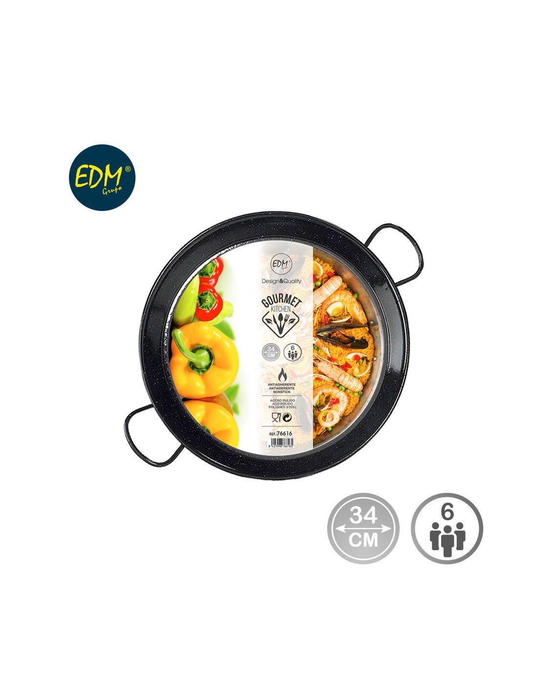 Paellera tradicional de acero esmaltado ø34cm (6 personas). apta para cocinas de gas. fabricacion nacional. atención: requiere mantenimiento. debe ser almacenado con una cubierta de aceite. vaello
