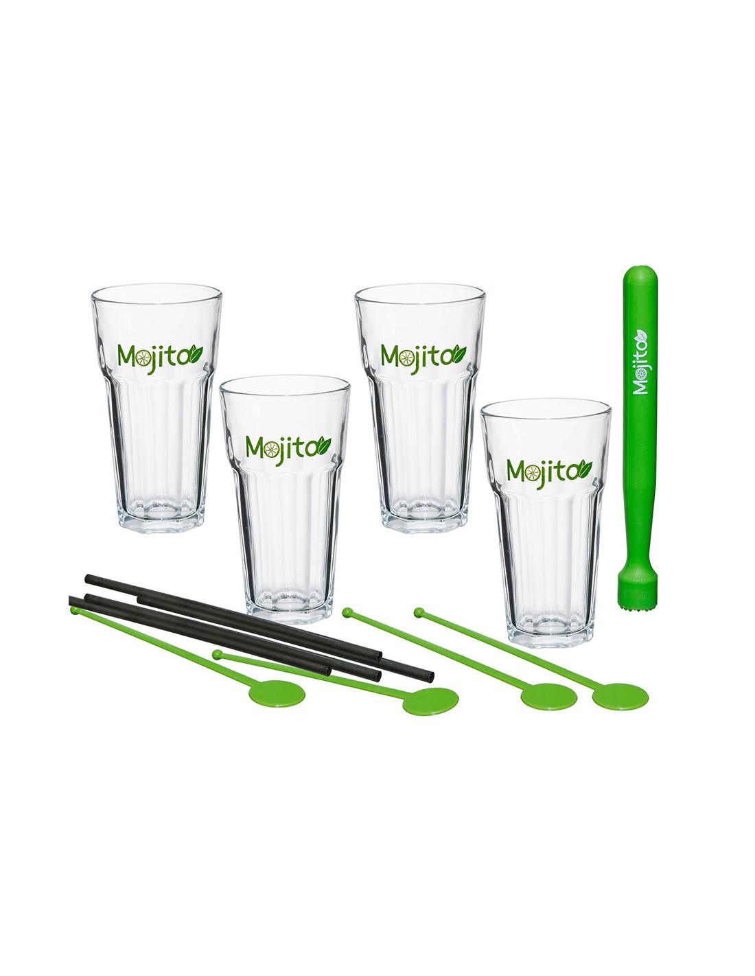 Kit para mojitos. kit con 13 piezas: 4 vasos grandes, 4 pajitas color negro, 4 mezcladores color verde, 1 mortero color verde