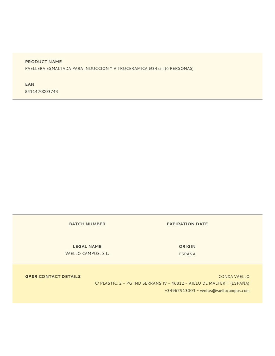 Paellera esmaltada ø34cm (6 personas) apta para cocinas de induccion y vitroceramica. fabricacion nacional. atención: requiere mantenimiento. debe ser almacenado con una cubierta de aceite. vaello