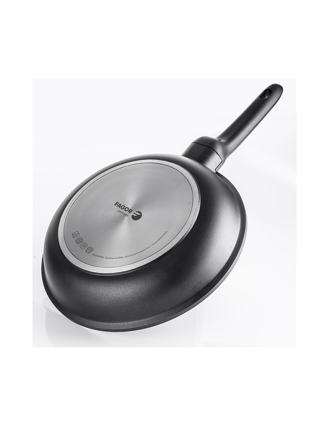 Sartén alutherm ø20cm negra aluminio 3004. aluminio fundido de alto espesor. espesor de cuerpo 2mm antiadherente de doble capa xylan plus reforzado efecto granito. fondo termodifusor impaksteel de máxima resistencia que optimiza la conductibilidad térmica. mangos ergonómicos de baquelita termoaislante. libre de cadmio y pfoa. 0,0% metales pesados. apto para todo tipo de fuegos. fagor
