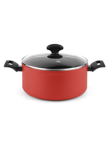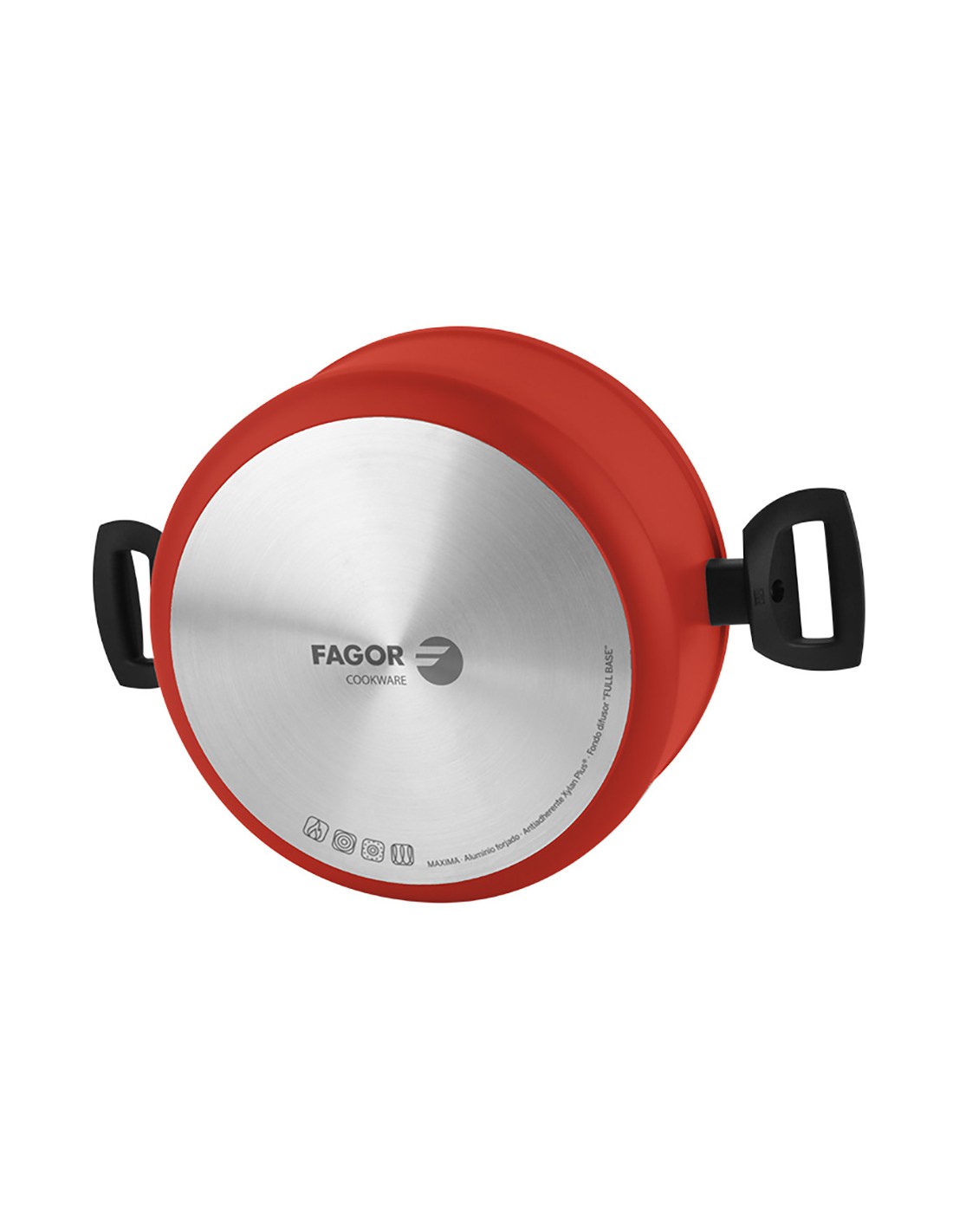 Olla maxima + tapa ø20cm roja aluminio 3004. aluminio forjado de 4mm. antiadherente de doble capa xylan plus. fondo termodifusor fullbase de máxima resitencia y conductibilidad. tapa de vidrio termoresistente con cerquillo de acero inoxidable y chimenea. asas ergonomicas de baquelita termoaislante. acabado exterior en color mate. apto para todo tipo de fuegos. fagor ø20x10cm (diámetro/alto)