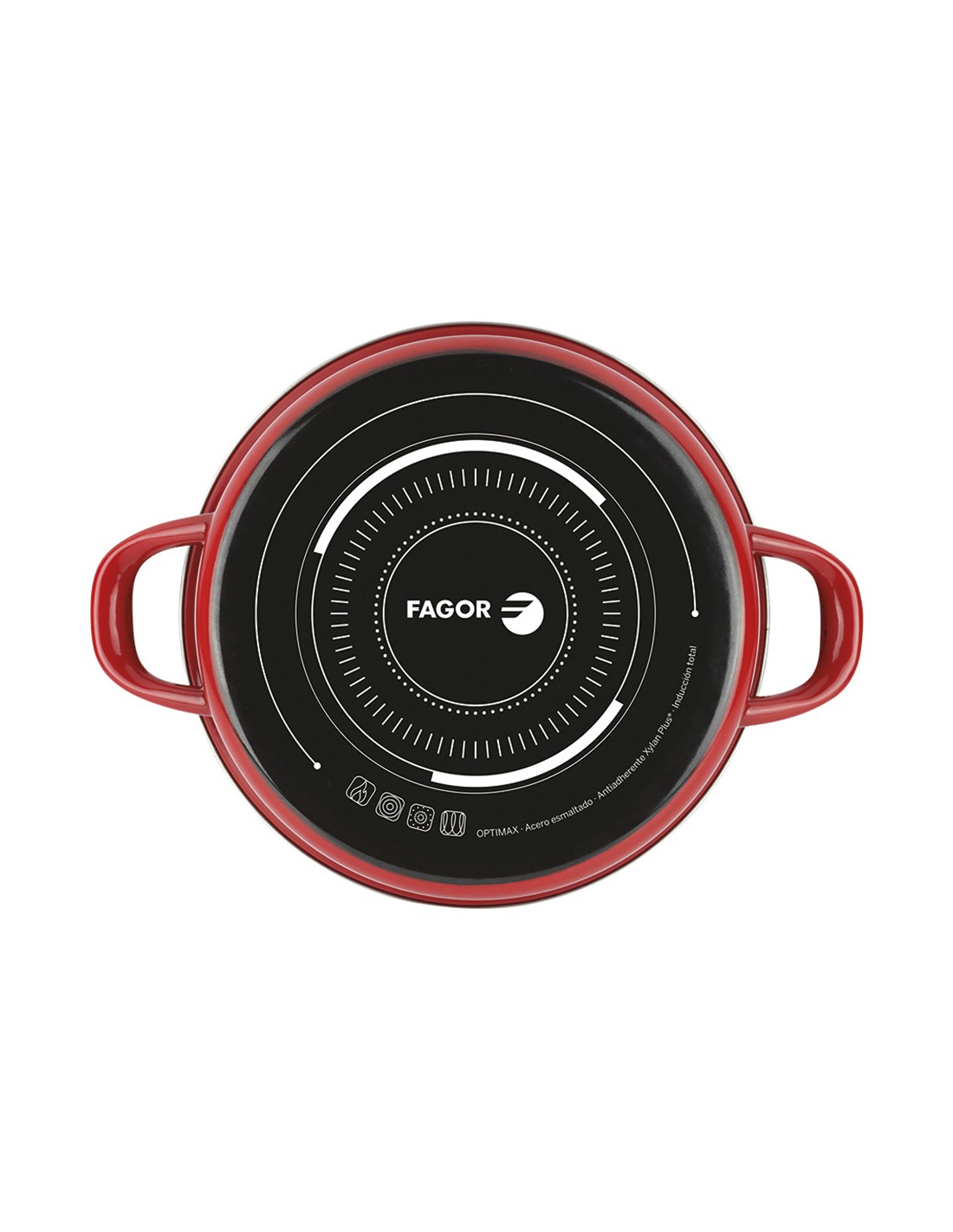 Tartera optimax ø26cm roja acero esmaltado aisi 430. alto espesor de acero con 5 capas de recubrimiento. antiadherente de doble capa xylan plus. cerquillo de acero inoxidable. mangos ergonomicos de baquelita termoaislante. libre de cadmio y pfoa. 0,0% metales pesados. apto para todo tipo de fuegos. apto para horno. fagor ø26x8cm (diámetro/alto)
