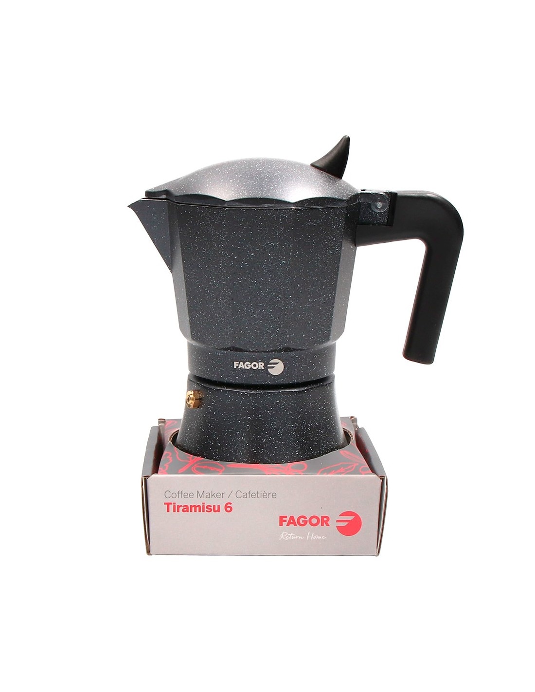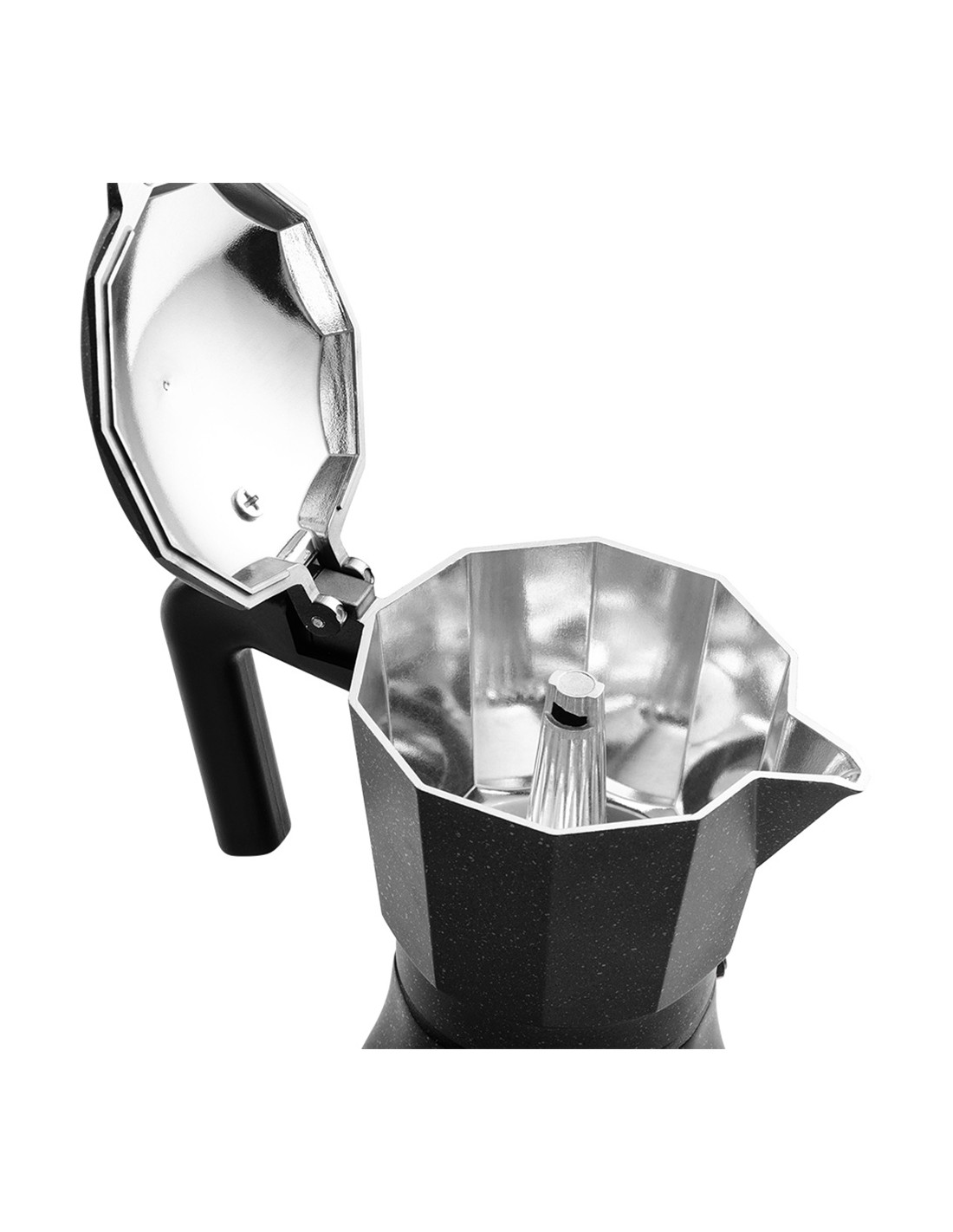 Cafetera tiramisu 9 tazas aluminio. acabado interior pulido. junta de silicona de gran durabilidad. mangos termoaislantes fabricados en nylon muy resistente. apto para gas, vitroceramica y electrica. no apto para induccion. no apta para lavavajillas