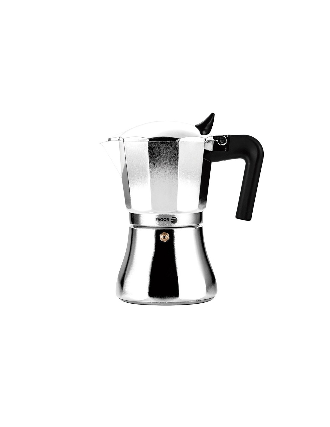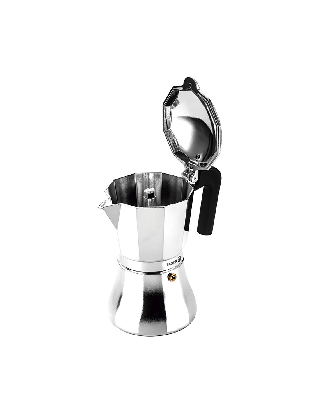 Cafetera cupy 6 tazas aluminio. base con fondo encapsulado por impacto (acero y aluminio) especial inducción. acabado exterior e interior pulido espejo. junta de silicona de gran durabilidad. mangos termoaislantes fabricados en nylon muy resistente. apto para todo tipo de fuegos. no apta para lavavajillas