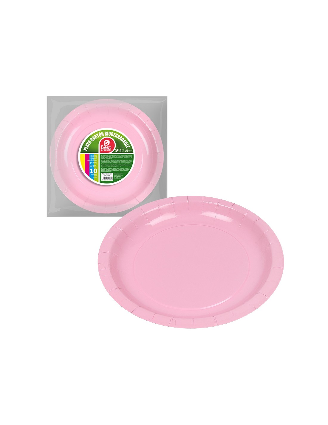Pack con 10 unid. platos de cartón rosa baby ø20cm (diámetro) best products green