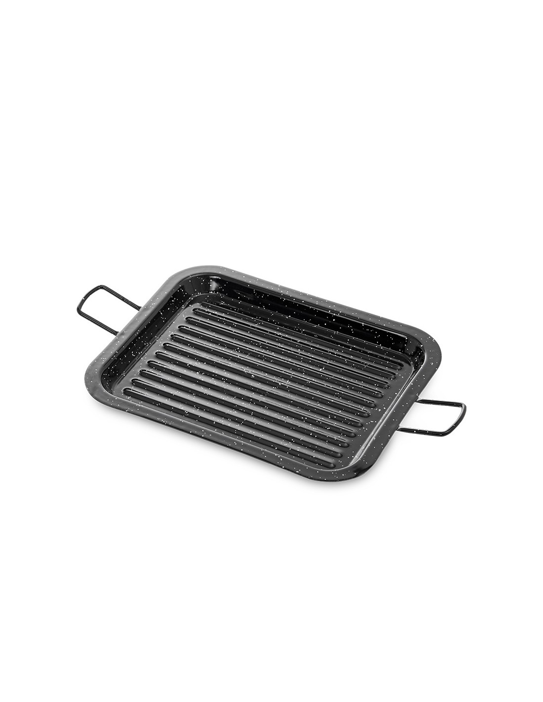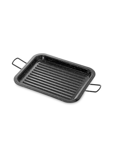 Asadora rectangular esmaltada 27x21cm. producto fabricado en acero laminado en frío y recubierto con una capa de esmalte antiácido. las asadoras de acero esmaltado se utilizan para asar todo tipo de carnes, pescados y verduras. apta para fuegos de llama. vaello