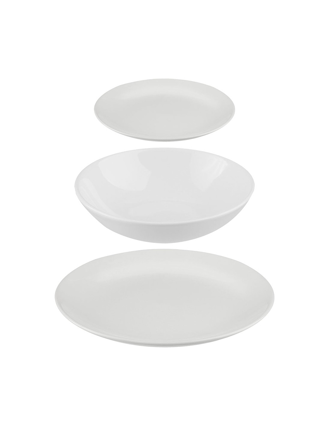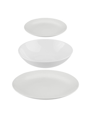 Vajilla 18 piezas color blanco. medida plato plano: ø26cm. medida plato mediano: ø21cm. medida plato de postre: ø20cm.