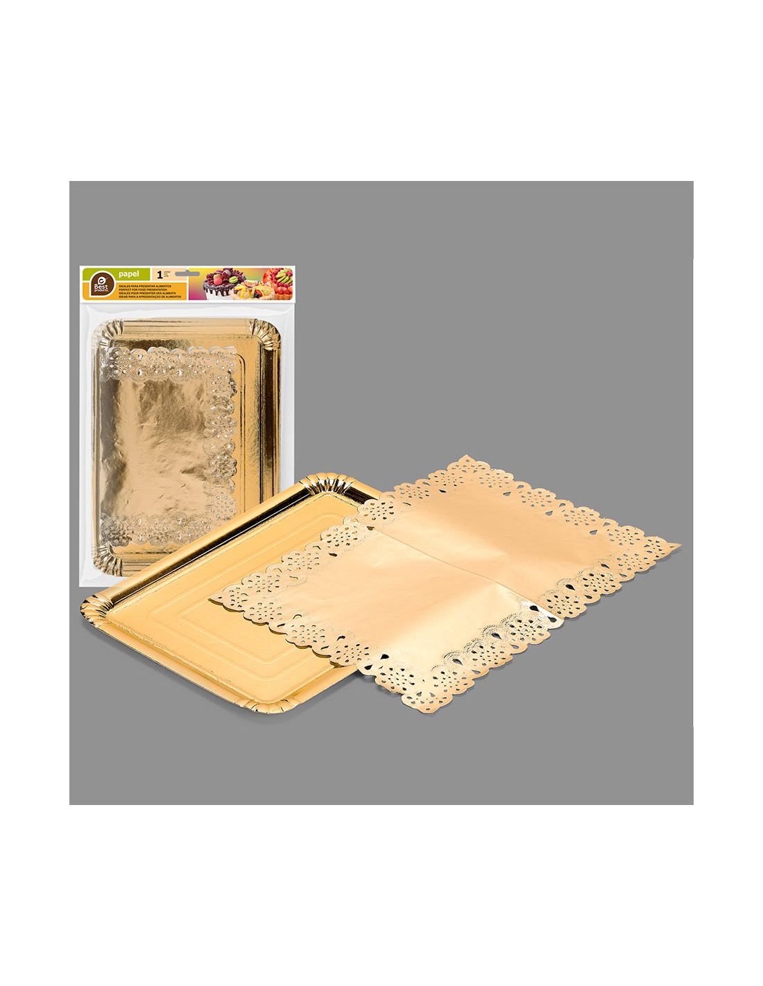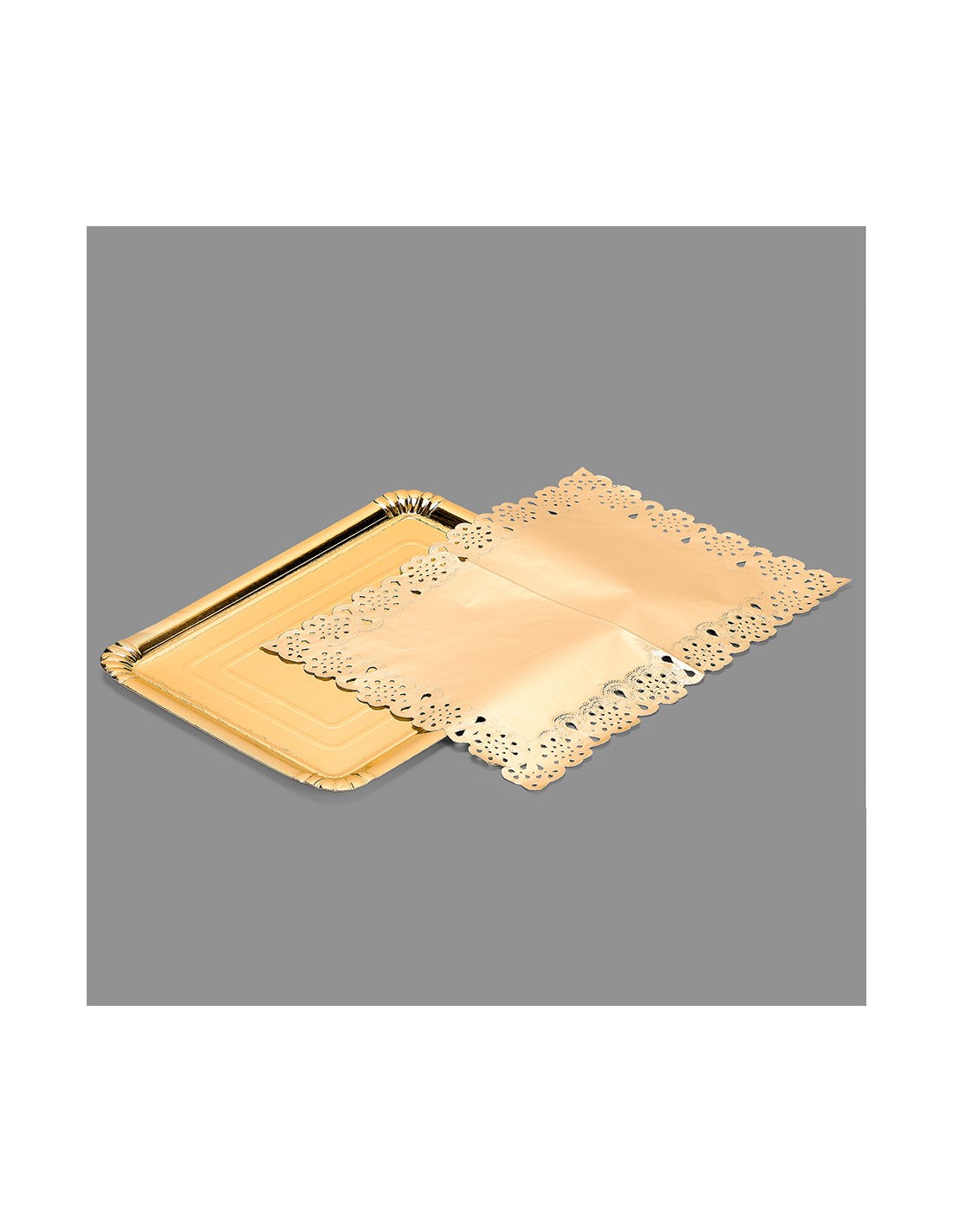 Bolsa con 1 bandeja rectangular con blonda oro 25x34cm (ancho/fondo)