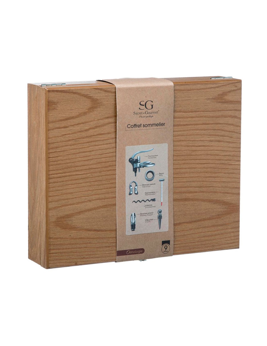Caja de madera sommelier con 9 piezas. contiene: sacacorchos, termómetro, tapón vertedor, protector cuello de botella, 2 mechas/espirales, cortacápsulas, 2 tapones y caja de madera natural