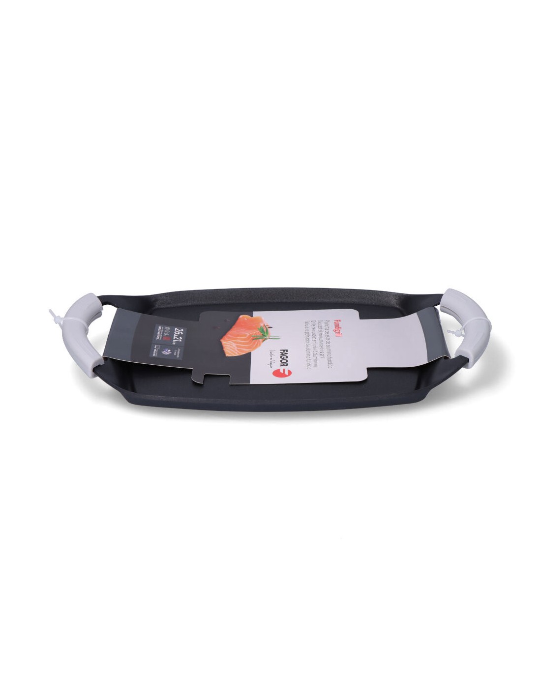 Plancha parrilla fundigrill aluminio 26cm. tamaño superficie cocción 26x20cm (ancho/fondo). con asas de silicona extraibles y termo aislantes. construida en una sola pieza, indeformable. apta para el horno (sin las asas de silicona). apta para todo tipo de fuegos. apto para lavavajillas, fabricado con teflon dupont. fagor