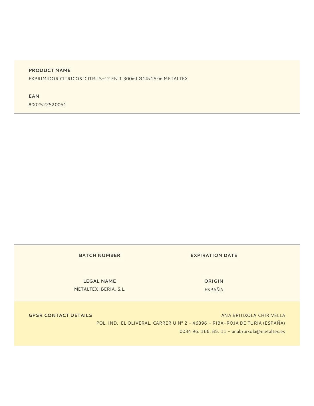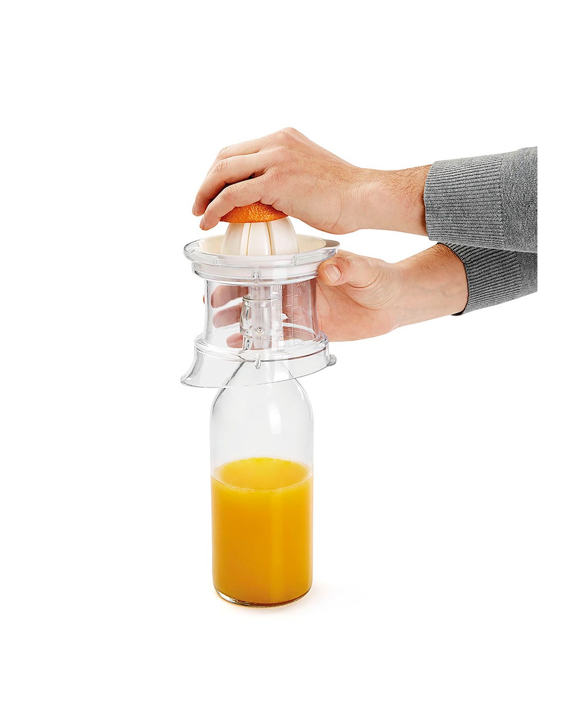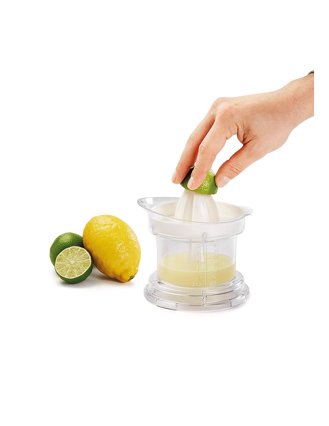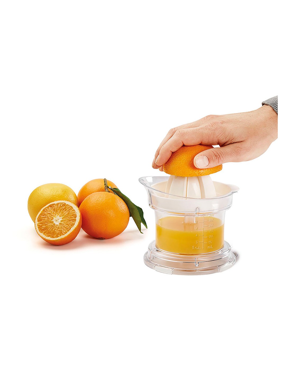 Exprimidor citrus+ 2 en 1 300 ml, ø14 x 15 cm. 2 escariadores de distintos tamaños para citricos grandes (naranjas) y pequeños (limones, limas). con embudo integrado para exprimir directamente en la botella. con recipiente graduado 300 ml. base antideslizante. apto para lavavajillas