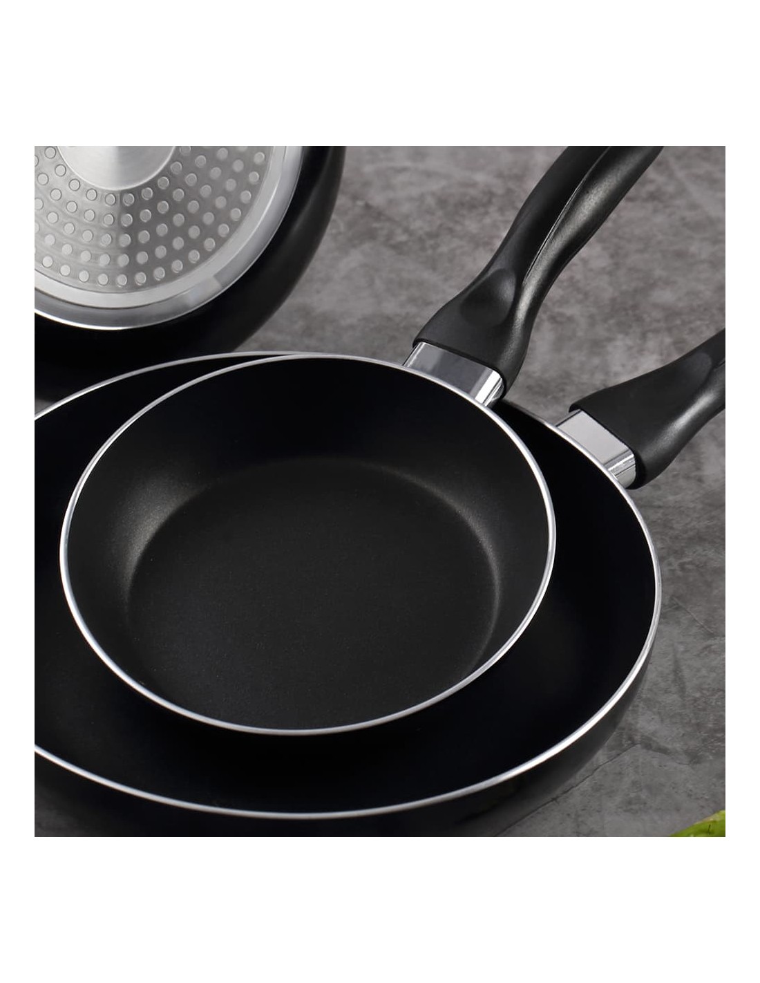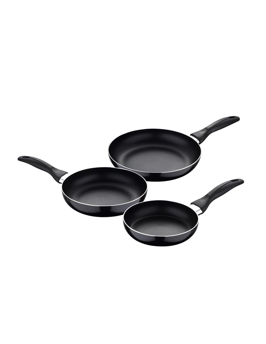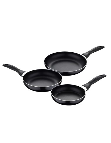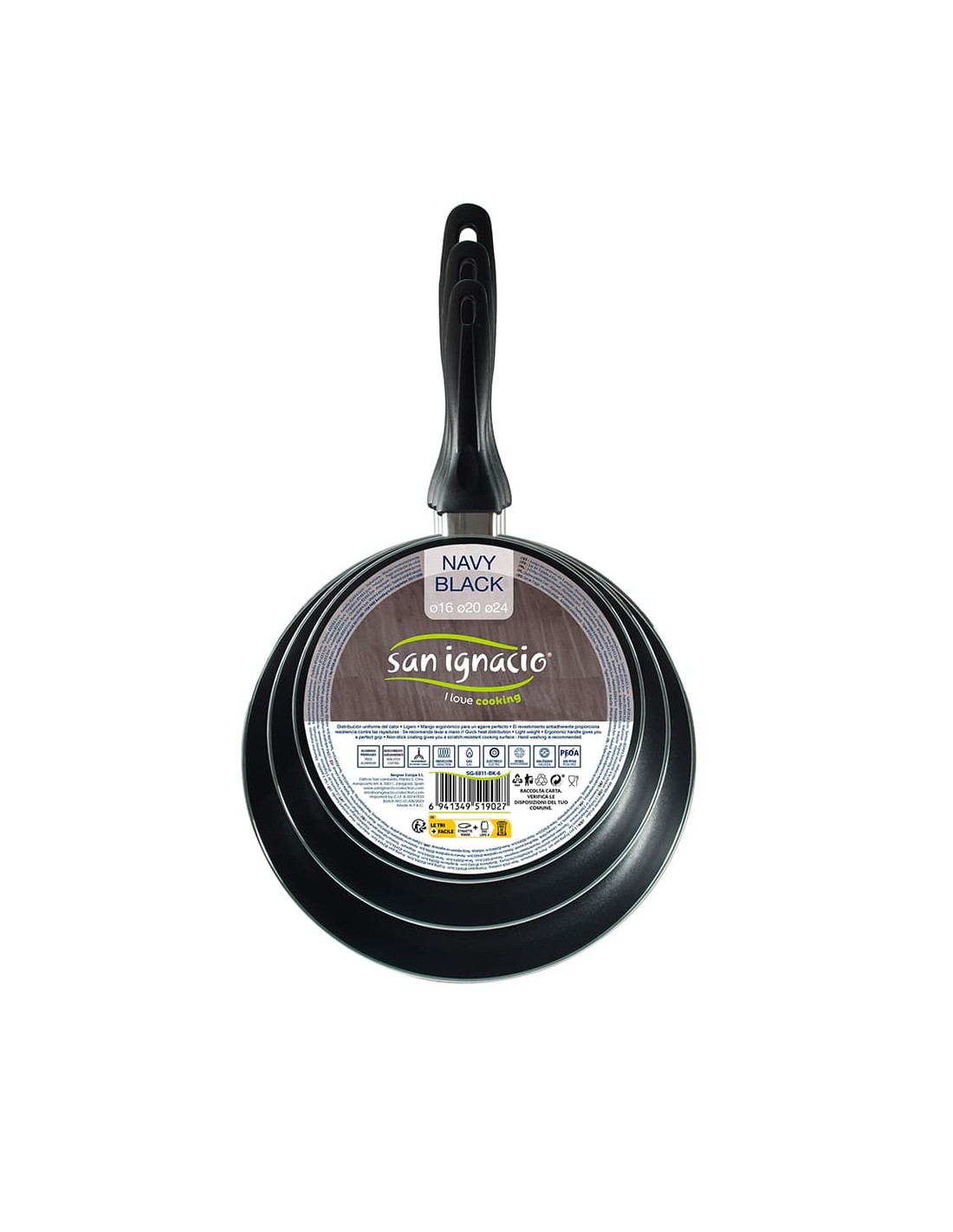 Set 3 sartenes (16+20+24cm) aluminio prensado, navy black, san ignacio. el set incluye: 1 sartén ø16x3.5cm + 1 sartén ø20x4.5cm + 1 sartén ø24x4.5cm. cuerpo fabricado en aluminio prensado. revestimiento interior antiadherente. apto para todo tipo de fuegos incluido inducción. mango de acabado profesional y ergonómico que se mantiene frío.