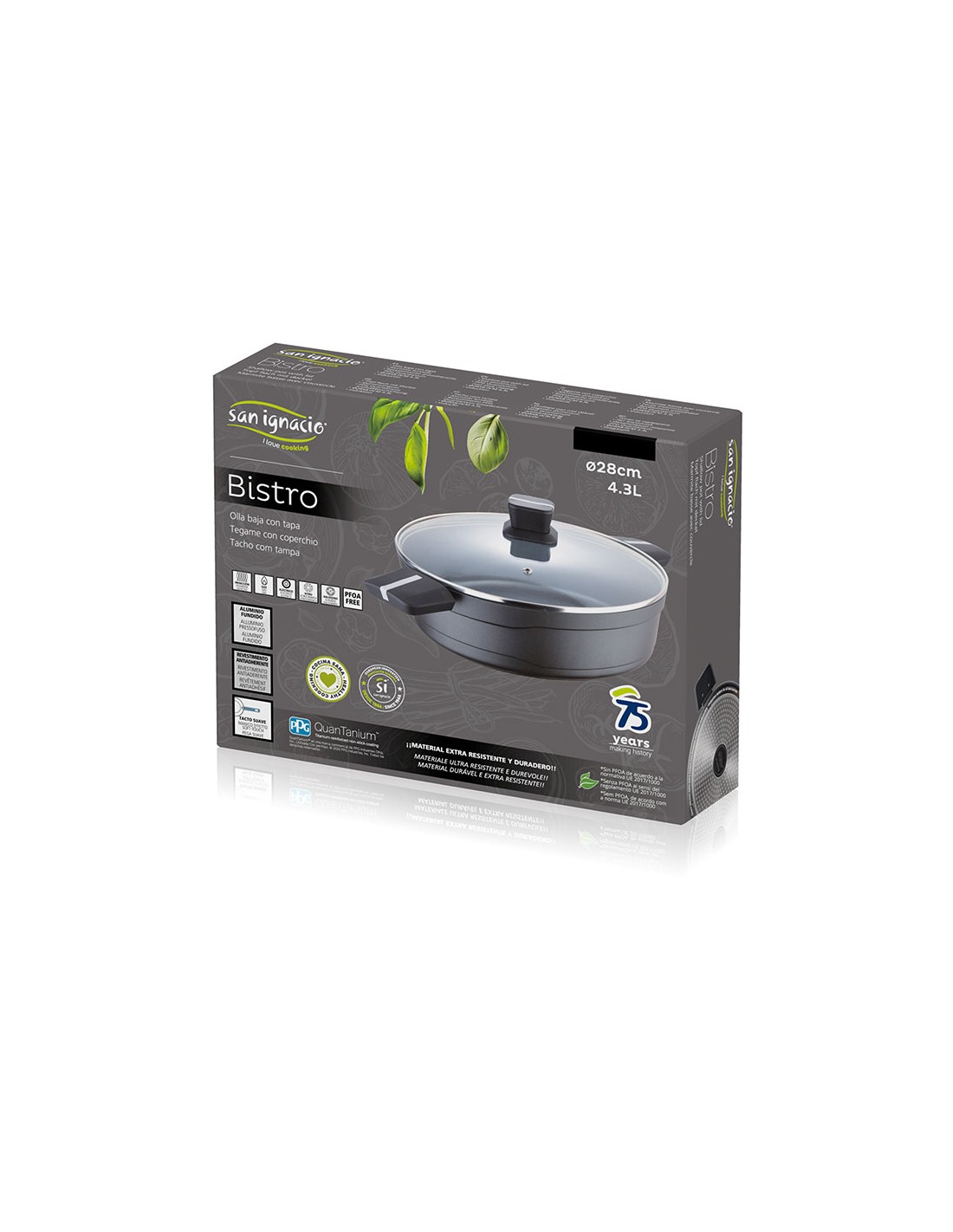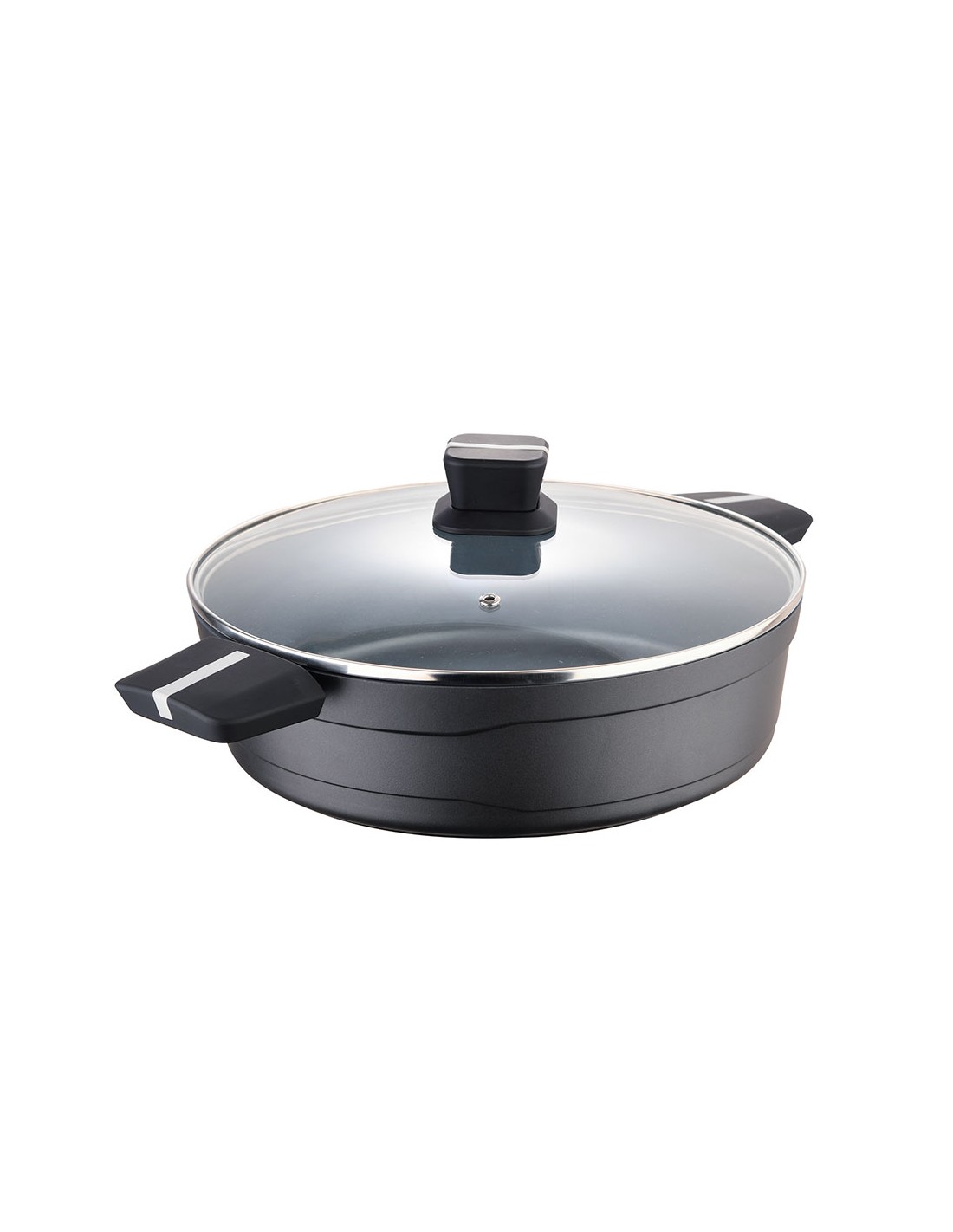 Olla baja ø28x8.0cm aluminio fundido 1,7mm de grosor ind con tapa bistro grey sg6427 san ignacio. olla baja con tapa interior en aluminio fundido revestimiento exterior en acero quaantanium wool en negro mate. dot inducción negro asa soft touch con inserto de silicona gris