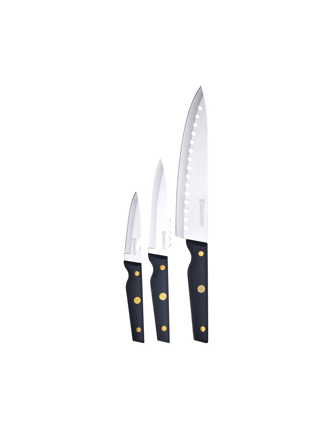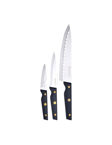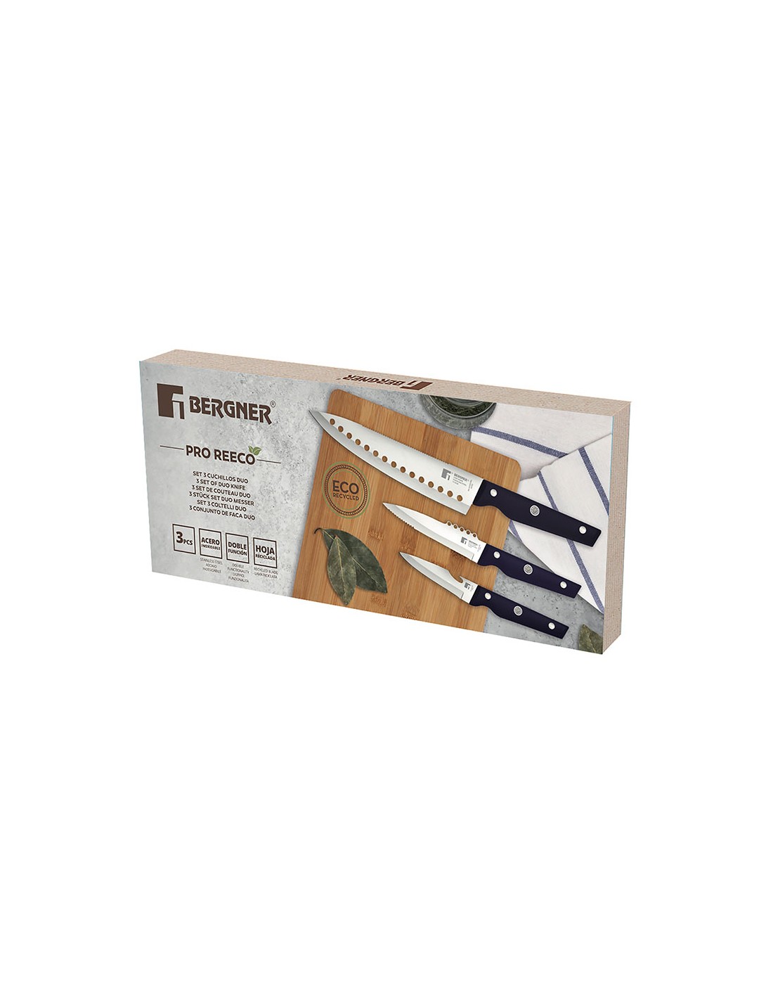 Juego de cuchillos 3 piezas de acero inoxidable pro reeco. contiene: cuchillo cocinero 20 cm, cuchillo utilitario 12,5 cm y cuchillo para verduras 10 cm. con mango de abs pulido brillante con tacto suave azul oscuro y 3 remaches de acero en color acero inoxidable