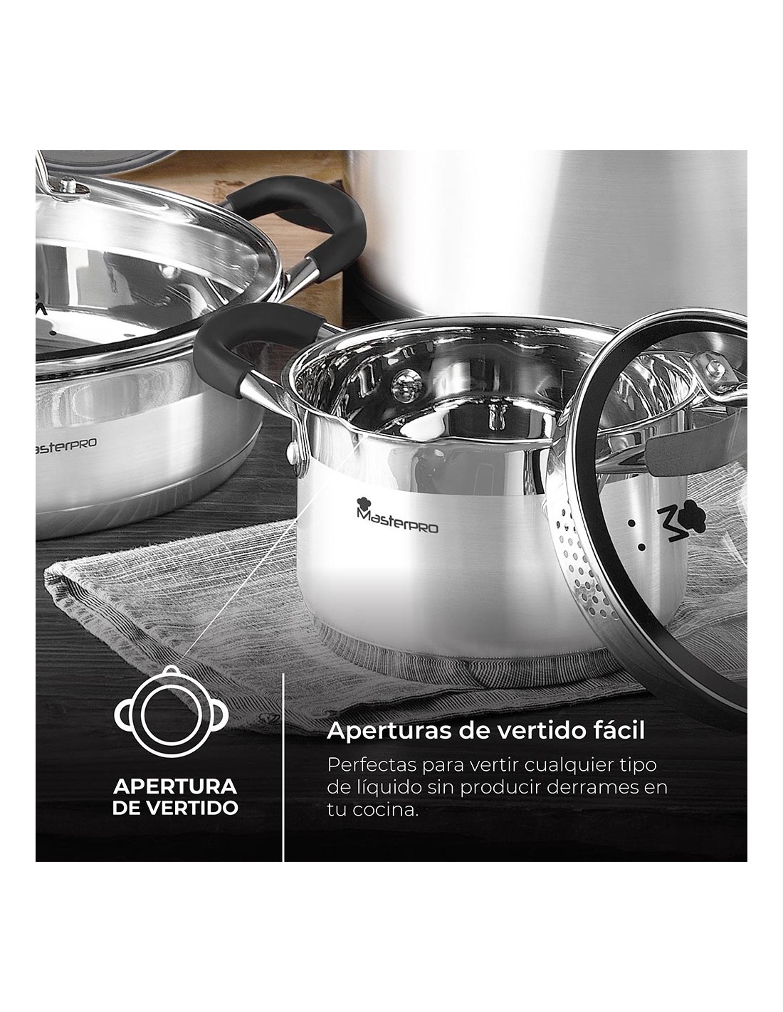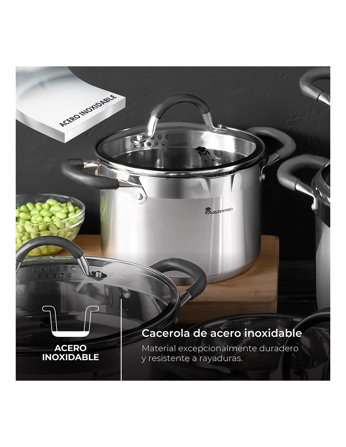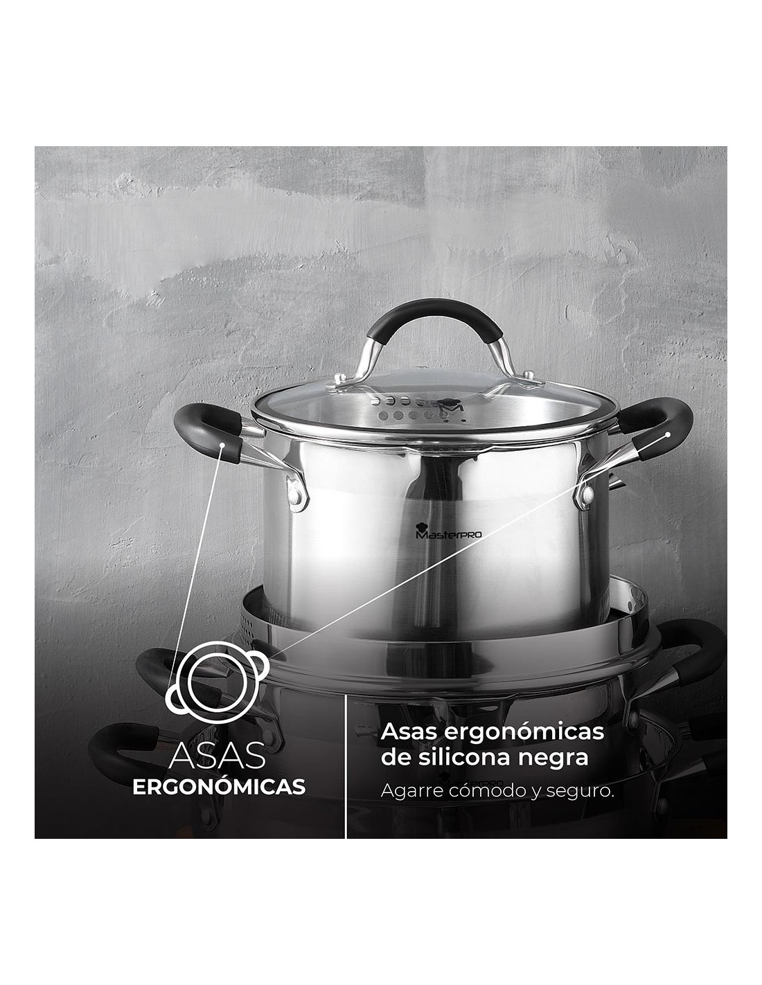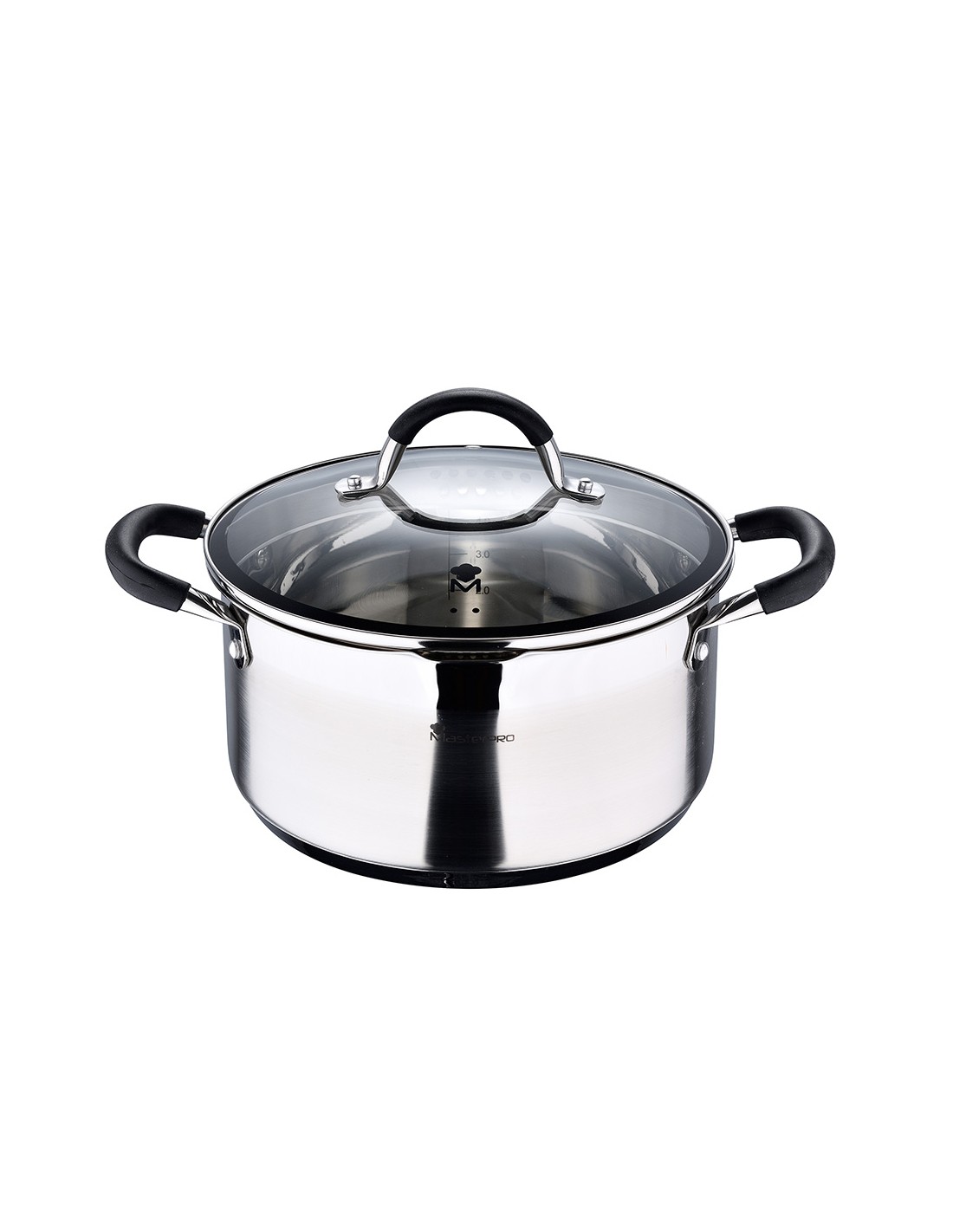 Olla ø24x12cm 5l acero inoxidable con tapa foodies bgmp-1502-bk masterpro. esta cacerola ø24x12cm con capacidad de 5l es un utensilio de aspecto moderno y funcionalidad para cualquier tarea culinaria. olla diseñada en acero inoxidable 18/10 que incluye una base ferromagnética de inducción completa. gracias a sus asas profesionales con inserciones de silicona, que se mantienen siempre frescas mientras se cocina, además ofrece un agarre perfecto y agradable sensación al tacto. cuenta con un fondo de inducción que la hace apta para todo tipo de cocinas.