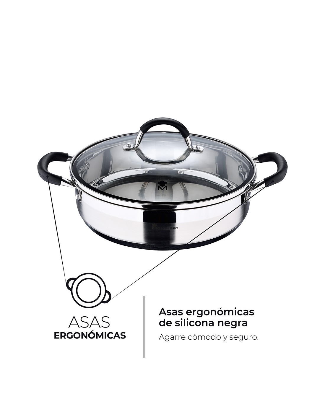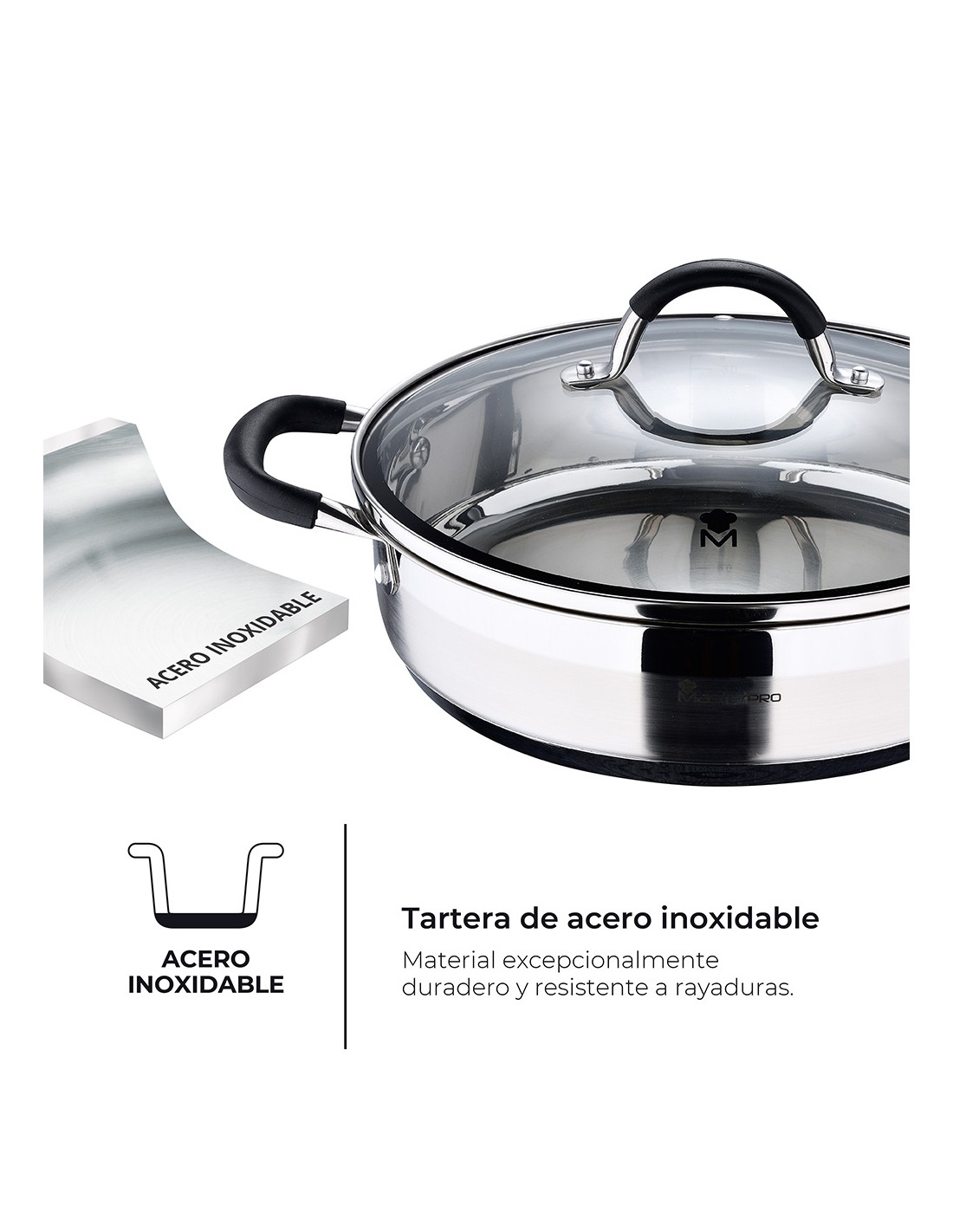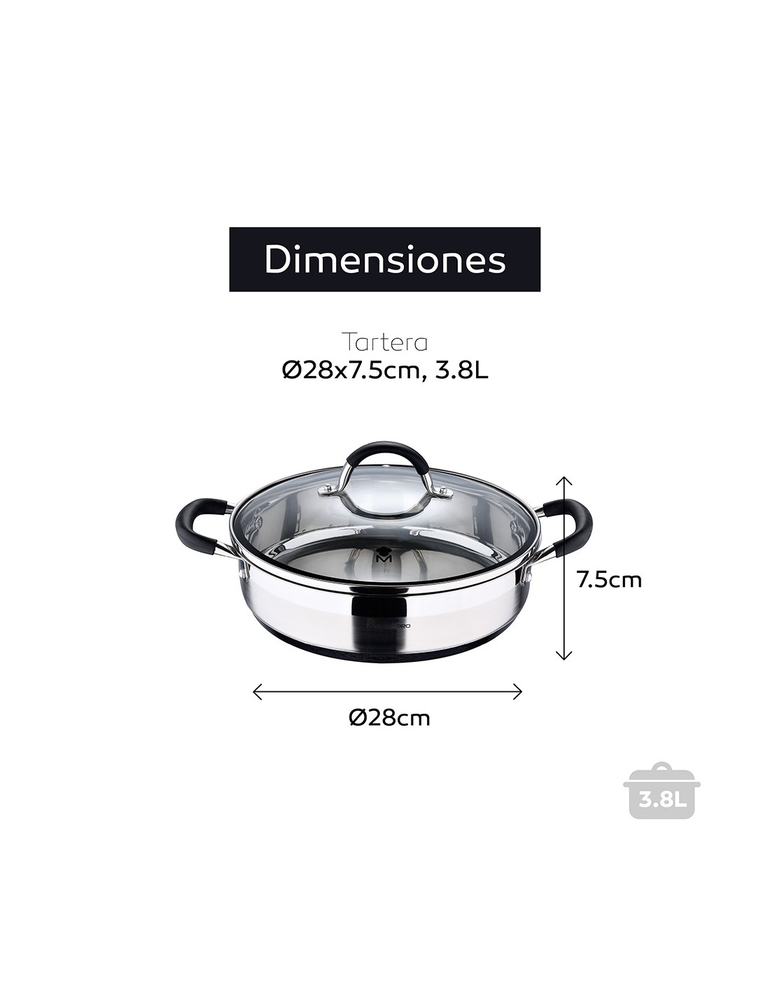 Tartera ø28x7,5cm 3,8l acero inoxidable con tapa foodies bgmp-1503-bk masterpro. esta cacerola ø28x7,5cm con capacidad de 3.8l. olla fabricada en acero inoxidable 18/10 que incluye una base ferromagnética de inducción completa. gracias a sus asas profesionales con inserciones de silicona, que se mantienen siempre frescas mientras se cocina, además ofrece un agarre perfecto y agradable sensación al tacto. cuenta con un fondo de inducción que la hace apta para todo tipo de cocinas.