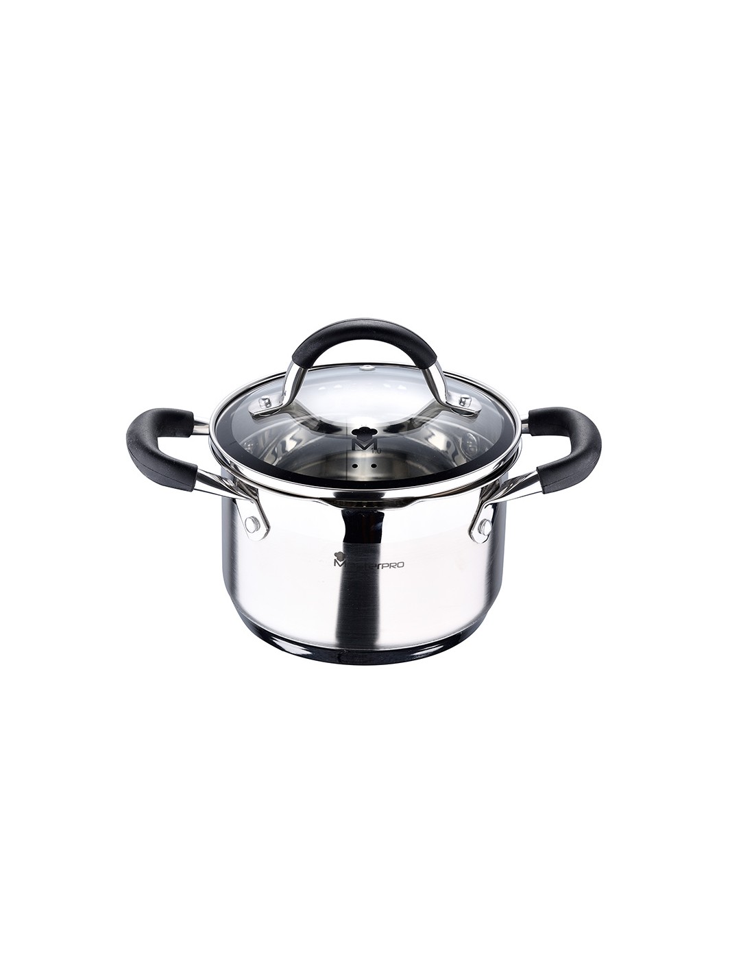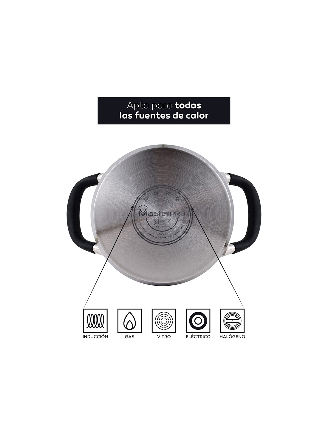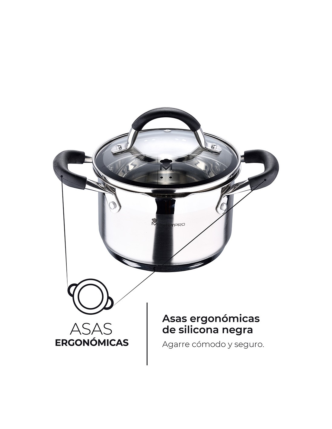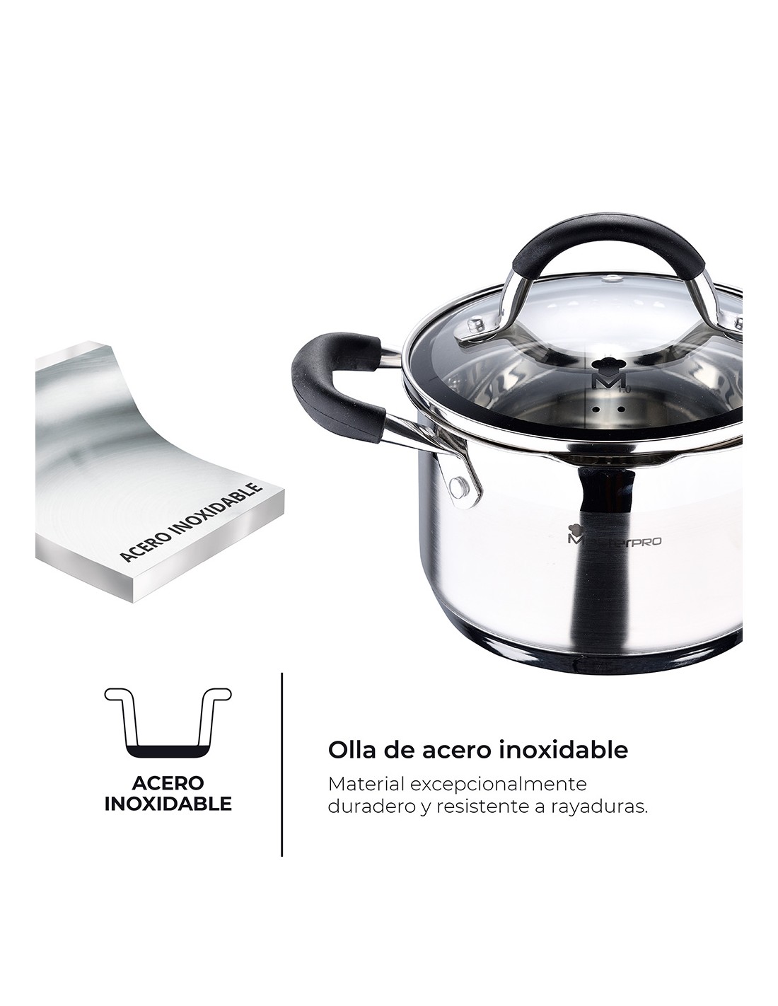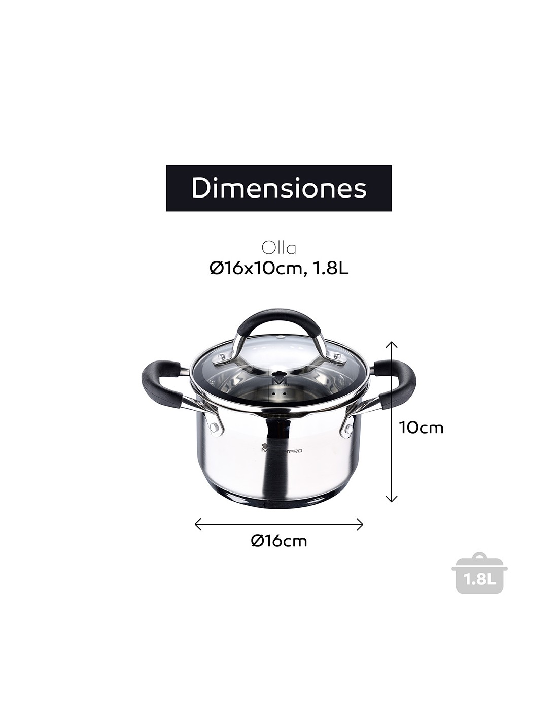 Olla ø16x10cm 1,8l acero inox con tapa foodies bgmp-1504-bk masterpro. la olla de 16 x 10cm tiene una capacidad de 1,8 l. está hecha de acero inoxidable, material que le proporciona una gran resistencia. incluye una escala de medición en su parte interna que permite una mayor presición con las cantidades de alimentos. es apta para todas las cocinas: gas, halógena, eléctrica, vitrocerámica e inducción. además, gracias a su tapa de vidrio podrás ver el grado de cocción sin levantar la tapa. gracias a sus asas recubiertas en siliconas, el manejo de esta pieza es muy cómodo.