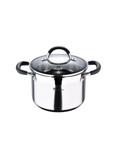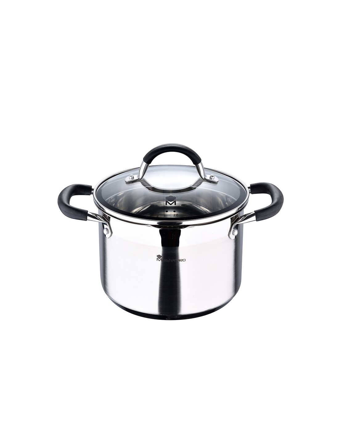 Olla ø20x14cm 4l acero inoxidable con tapa foodies bgmp-1505-bk masterpro. esta olla de masterpro foodies mide ø20x14cm y tiene capacidad de 4l. está fabricada en acero inoxidable, 18/10 color gris, con calidad de doble acabado mate/brillante de aspecto elegante, profesional y de alto rendimiento. gracias a su buen diseño, estructura y materiales, esta olla es la adecuada para las cocciones más exigentes, apta para inducción. incluye una tapa de cristal que permite mirar el proceso de cocción de los alimentos, sin necesidad de estar destapando la olla. otra de las ventajas de este artículo es que su tapa está equipada con doble escurridor de agua. esto hace que no sea necesario utilizar coladores para cocinar y ayuda a ahorrar tiempo en la cocina, para al recoger y limpiar. el revestimiento de silicona negra le va muy bien a cada mango y asa, y es un detalle más de seguridad y belleza de la olla. en el interior hay un práctico medidor que evita errores en el cálculo de tiempo.