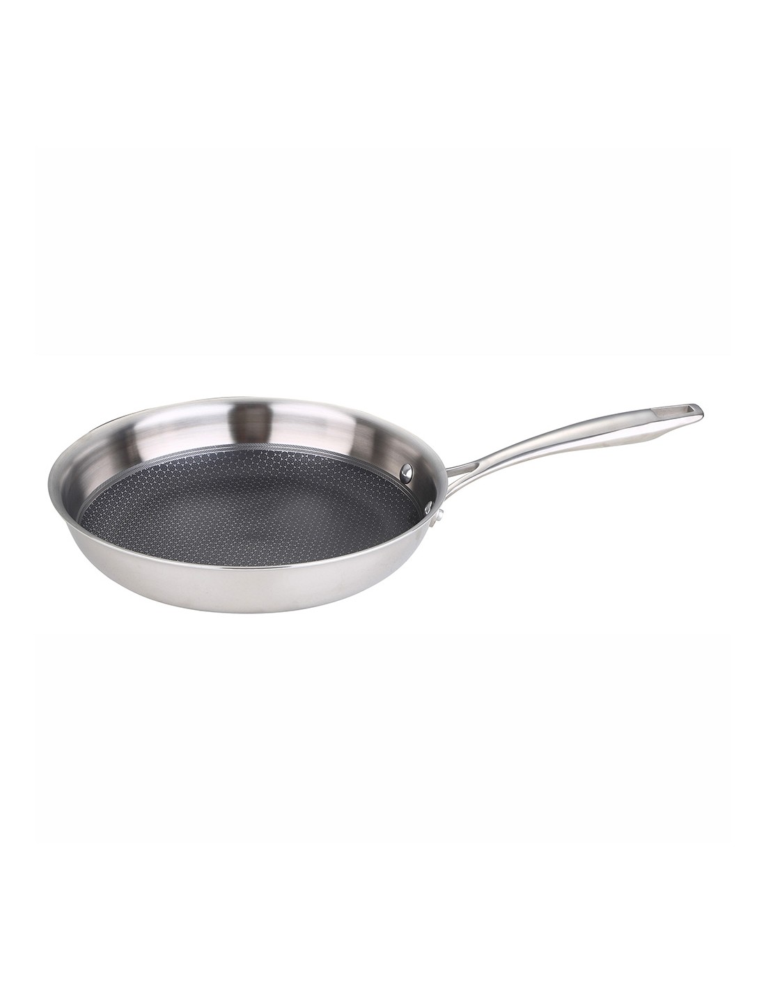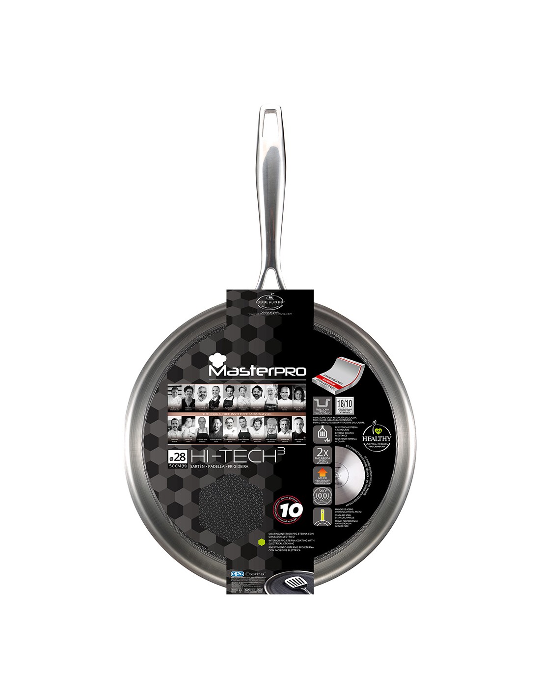 Sartén ø28x5,0cm de acero inoxidable hi-tech 3 bgmp-1632 masterpro. esta sartén esta fabricada en acero inoxidable 18/10 con un núcleo de aluminio. con esta combinación de materiales conseguimos que la temperatura se distribuya de forma uniforme y puedas cocinar tus alimentos homogéneamente. en su parte exterior, esta sartén tiene un revestimiento antiadherente, diseñado para resistir el paso del tiempo. la tecnología pallatium presente en esta sartén utiliza tres capas diferentes que refuerzan el lado más superficial y evitan que se raye o deteriore. ofrece unas propiedades de dureza y resistencia extraordinarias que hacen de esta sartén antiadherente sea la aliada perfecta para el uso diario. además, la textura de panel de abeja ayuda a evitar el deterioro progresivo, incluso trabajando con utensilios metálicos. otro motivo por el que te encantará cocinar con las sarténes hi-tech3 es su capacidad para conducir el calor rápidamente. con su base de 5mm ultra turbo de aluminio encapsulado es capaz de calentarse hasta tres veces más rápido y ofrece un rendimiento perfecto en cocinas de inducción, de gas, vitrocerámicas, placas eléctricas y fuegos halógenos.el diseño profesional también se nota en los mangos y asas. están realizados en acero inoxidable y con un diseño ergonómico. para evitar que el calor pase, llevan un tratamiento stay cool que bloquea la transmisión de temperatura a las zonas que entran en contacto con tus manos.