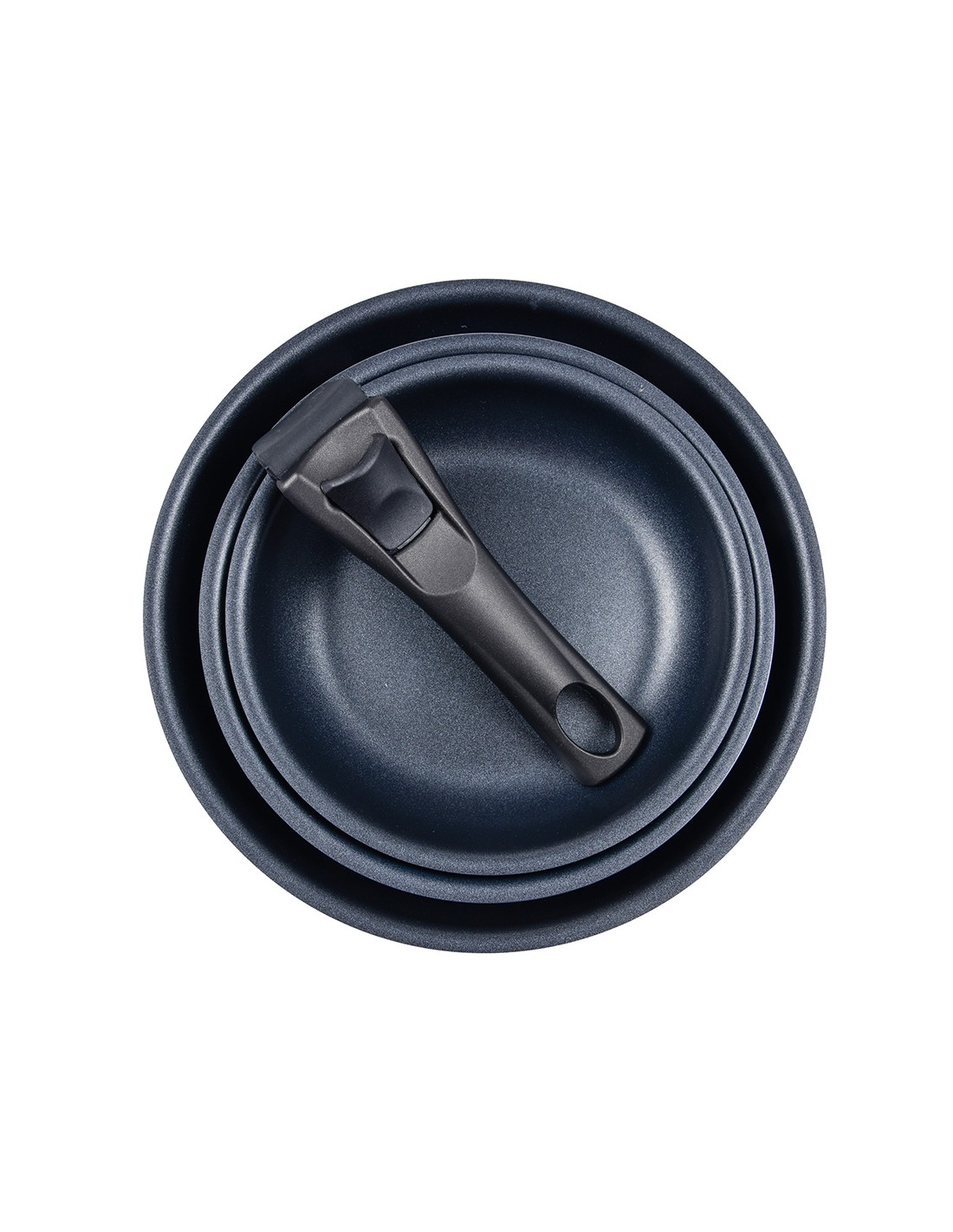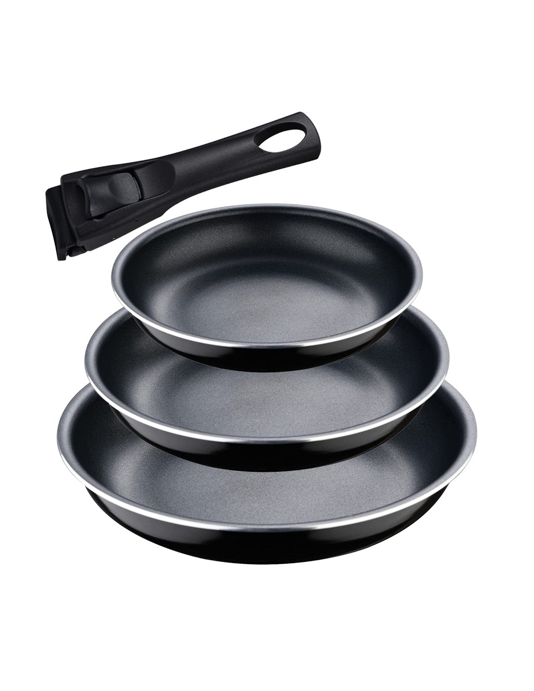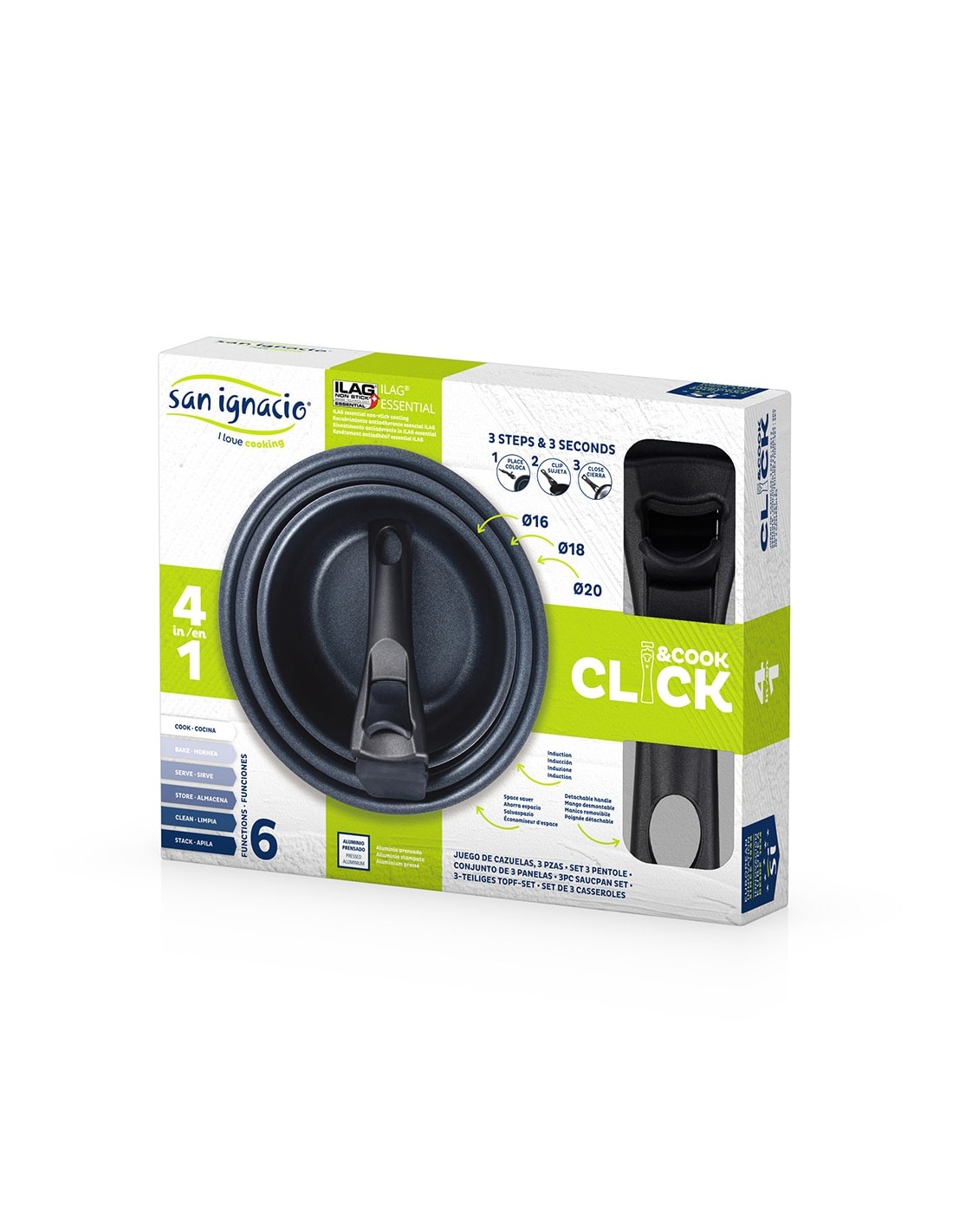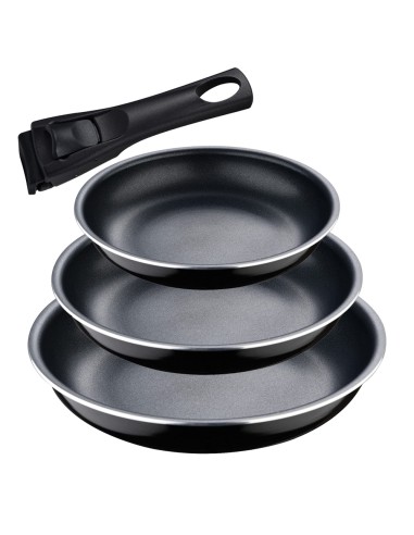 Set 3 sartenes (ø18+ø20+ø24cm) click & cook. consta de 3 sarténes de la colección click & cook en color negro de ø18, ø20 y ø24cm y cuentan con un mango multiusos. las sarténes están fabricadas en aluminio prensado, un material ligero y resistente. mango desmontable que se puede intercambiar entre todas las piezas. las sarténes son aptas para todo tipo de placas, incluida la de inducción, y son aptas para el lavavajillas, el horno (sin el mango) y el frigorífico.