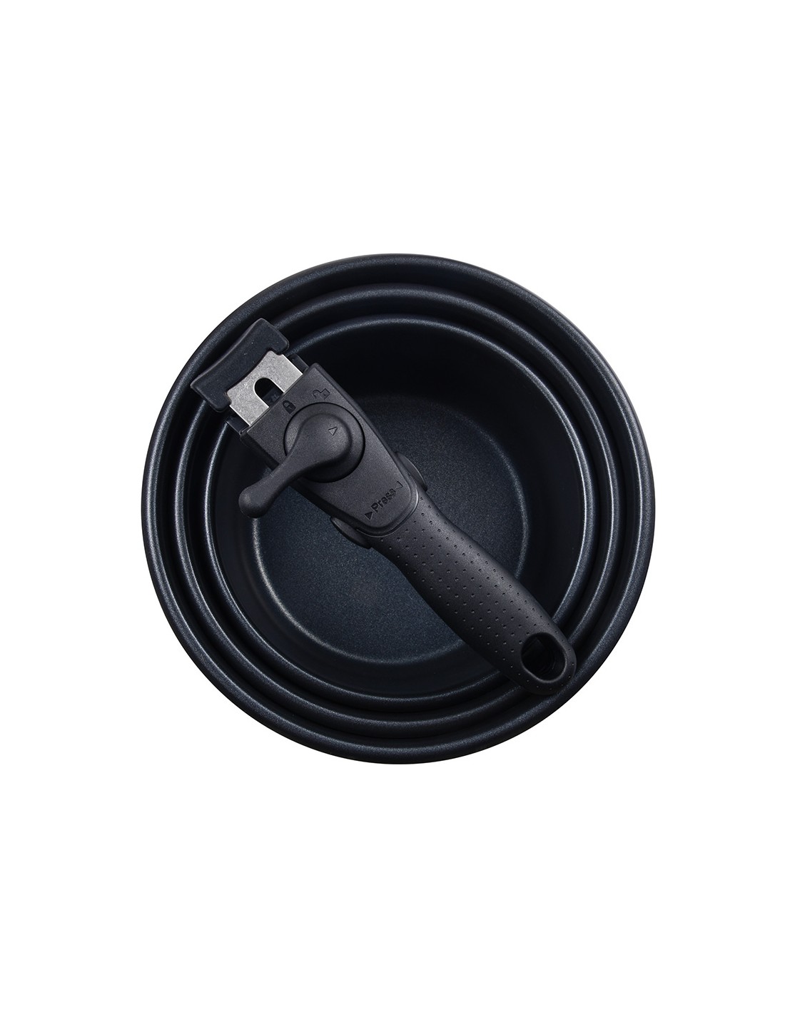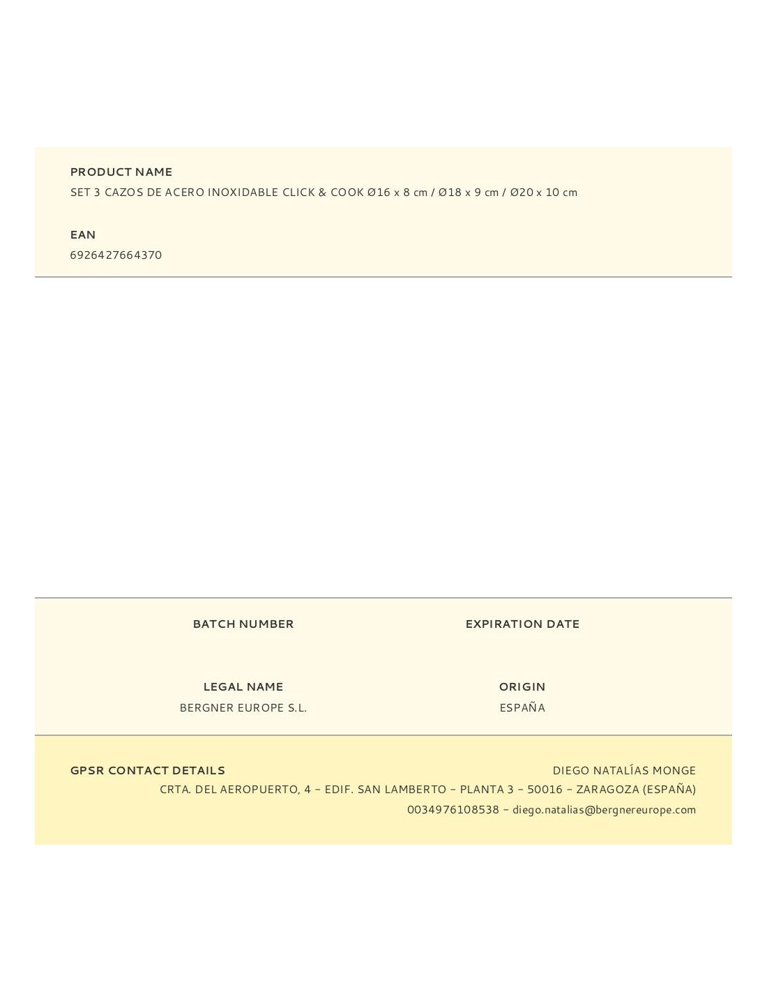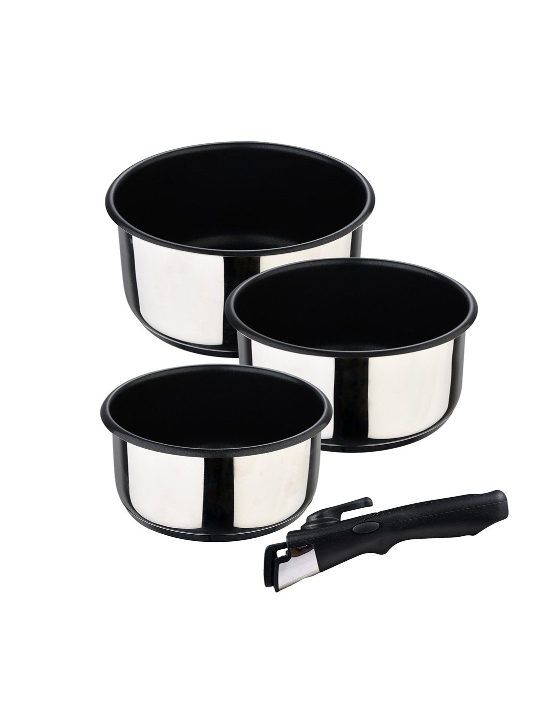 Set 3 cazos acero inoxidable click & cook bergner. juego de 3 cazos de acero inoxidable. ø16x8.0cm 1.5l, ø18x9.0cm 2.1l , ø20x10cm 3.0l con mango desmontable universal de de baquelita. aptas para inducción