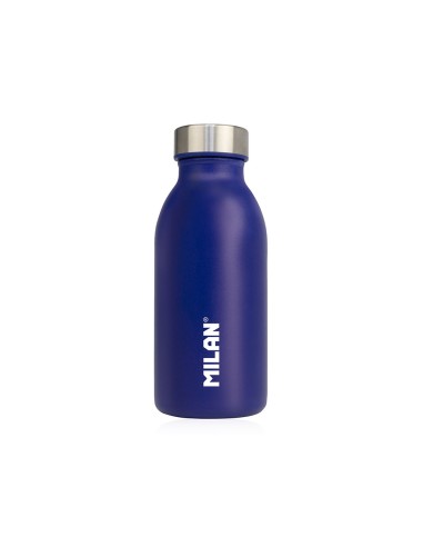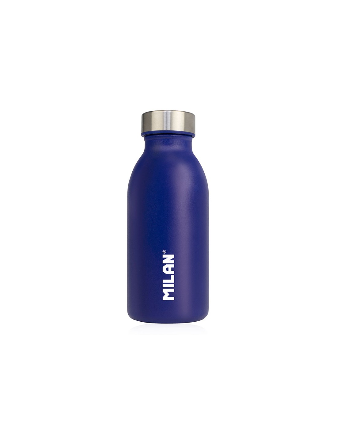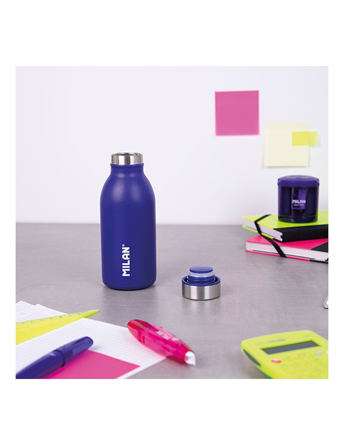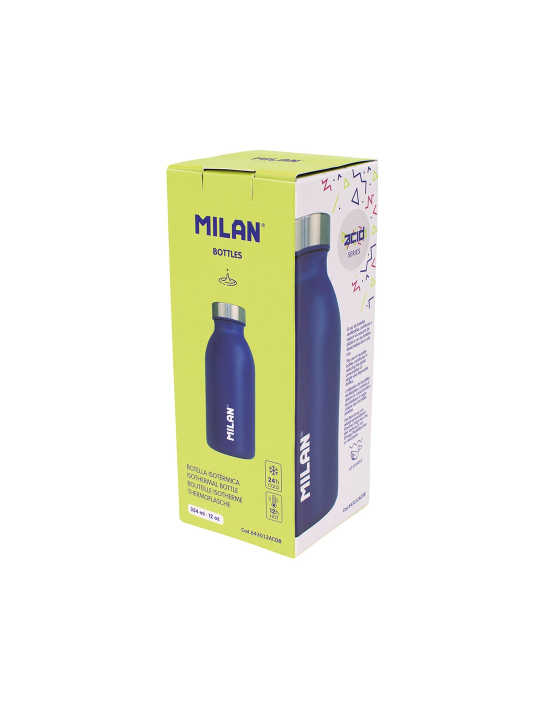 Botella isotérmica con doble pared de acero inoxidable. serie acid, color azul. capacidad: 0,35l. aislamiento al vacío que evita la condensación y permite que la parte exterior mantenga la temperatura ambiente. mantiene la temperatura del líquido contenido (hasta 12h bebidas calientes y 24h bebidas frías). tapón de rosca hermético, con junta de polipropileno. base de silicona antideslizante