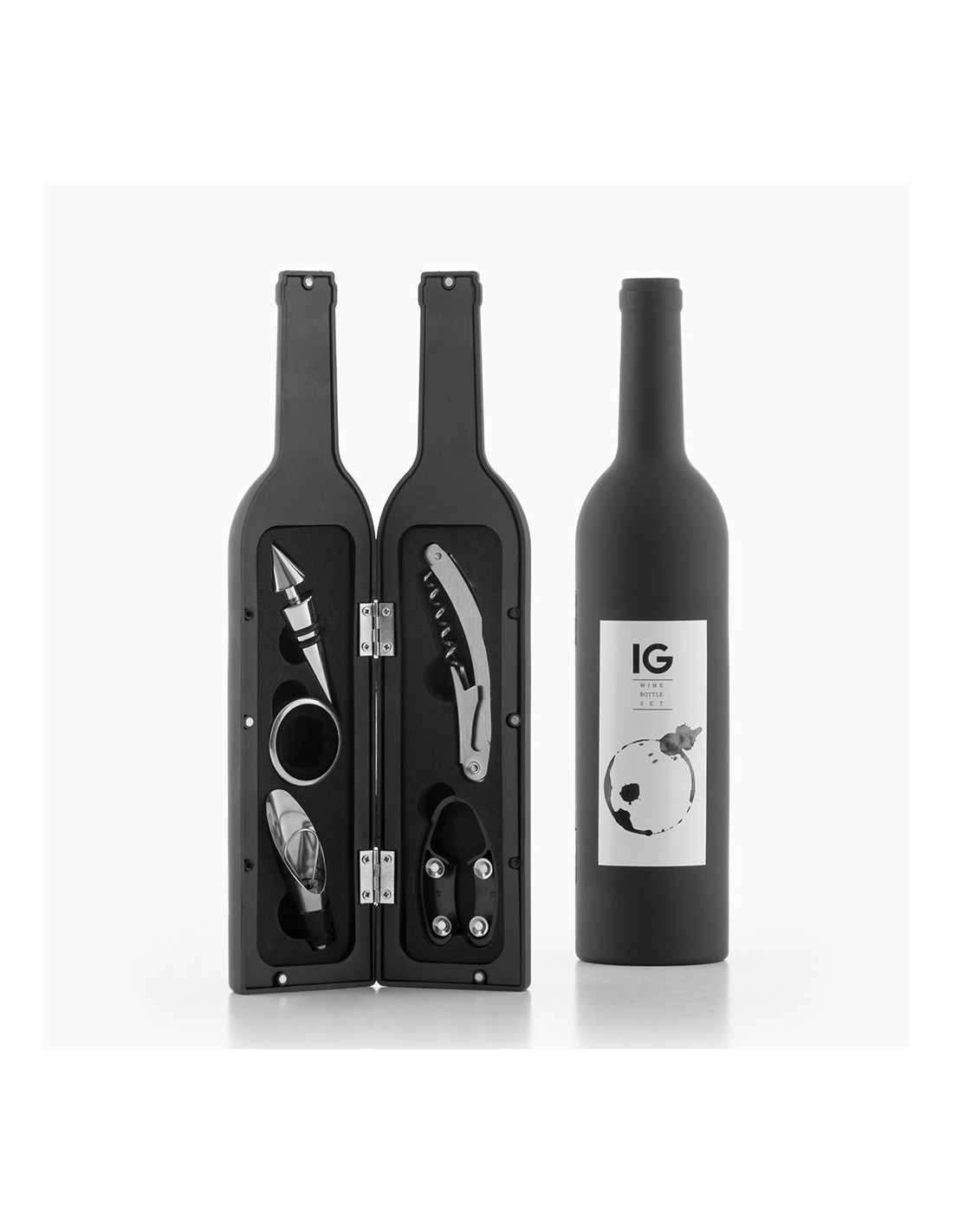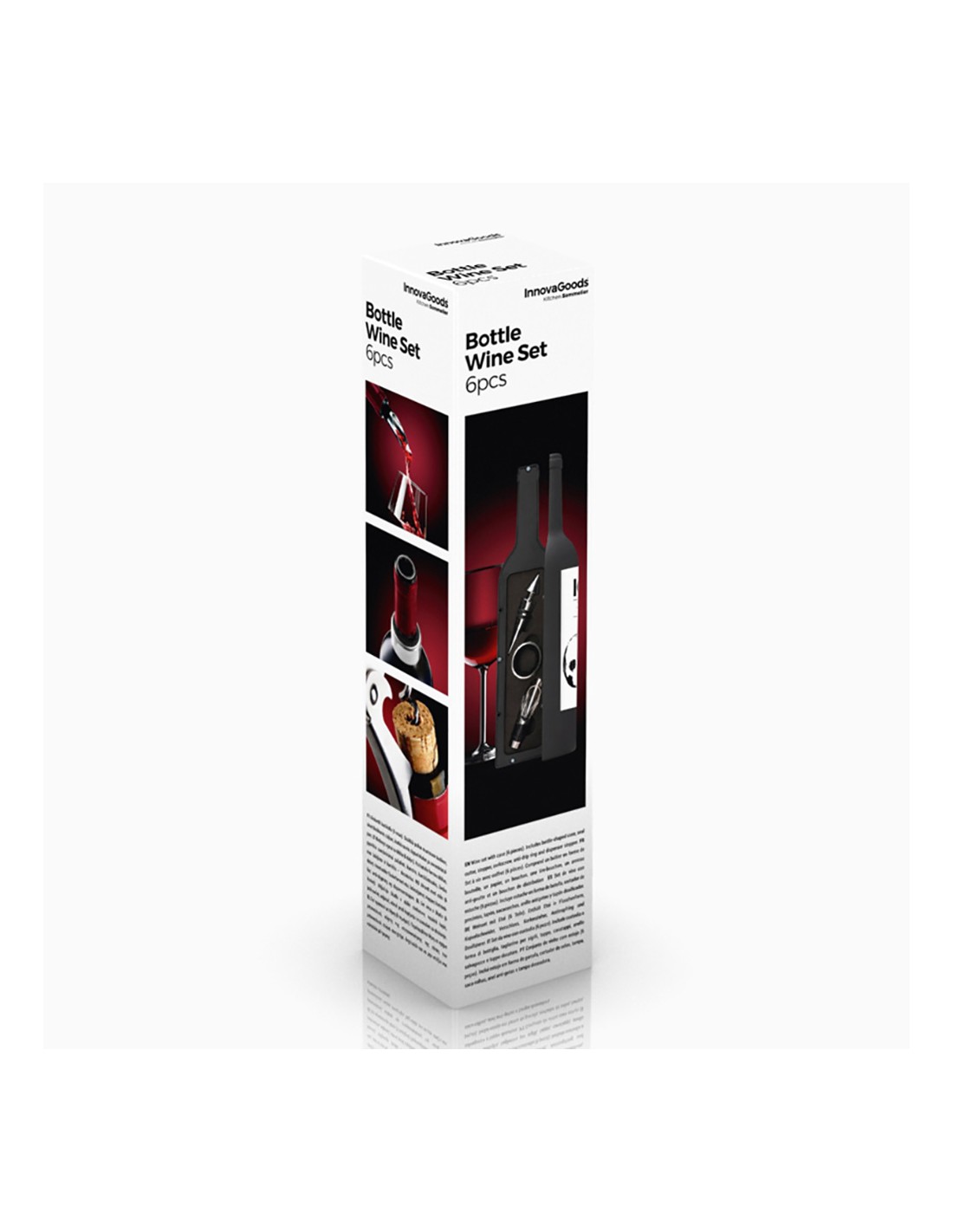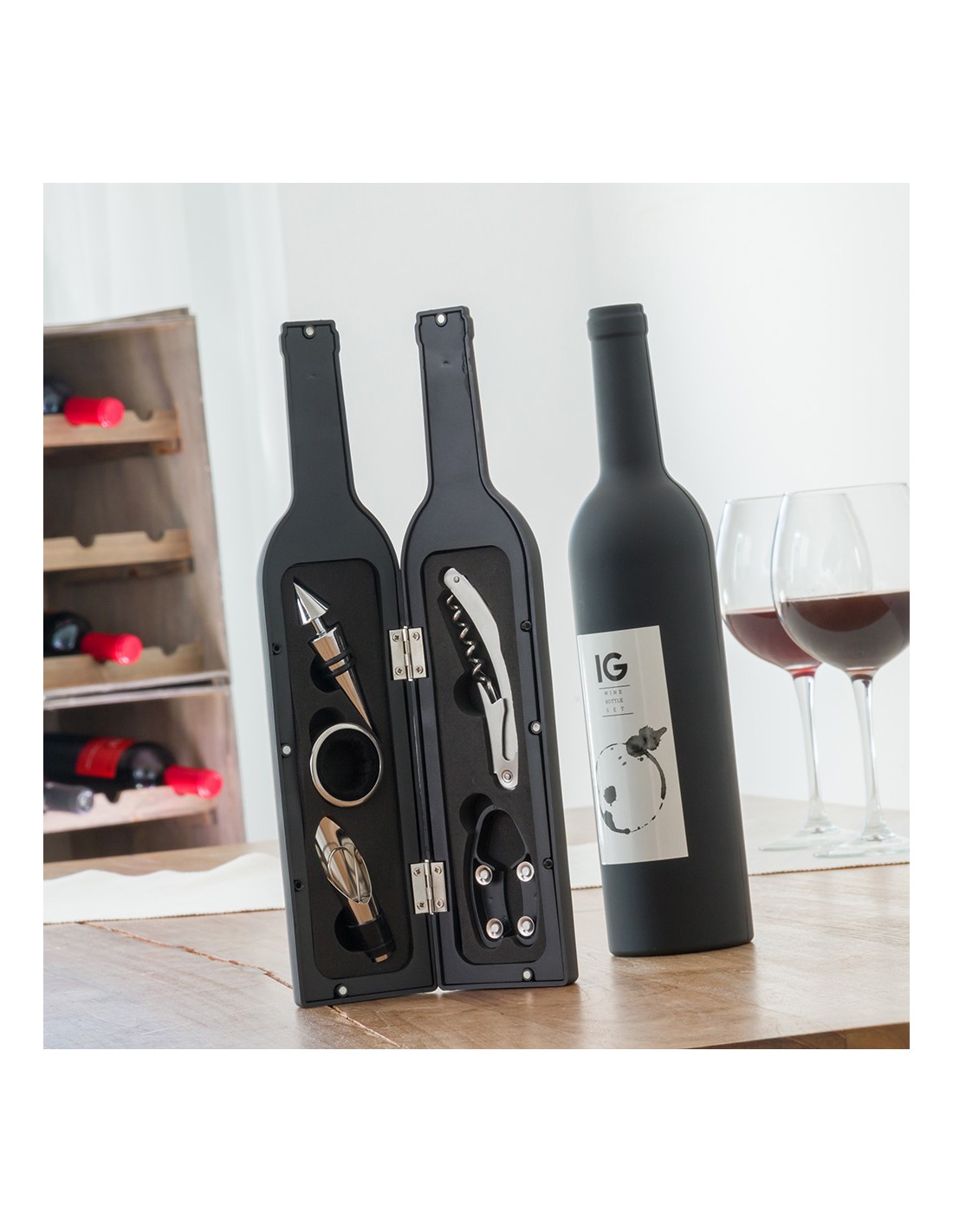 Estuche de vino con forma de botella accesorios de vino en diseño innovador set de accesorios para vino en forma de botella con medidas aproximadas de ø7 x 33 cm. incluye dosificador, sacacorchos, anillo antigoteo, cortador y tapón. diseño elegante en abs, acero inoxidable y aleación de zinc. ideal como regalo y funcional para almacenar.