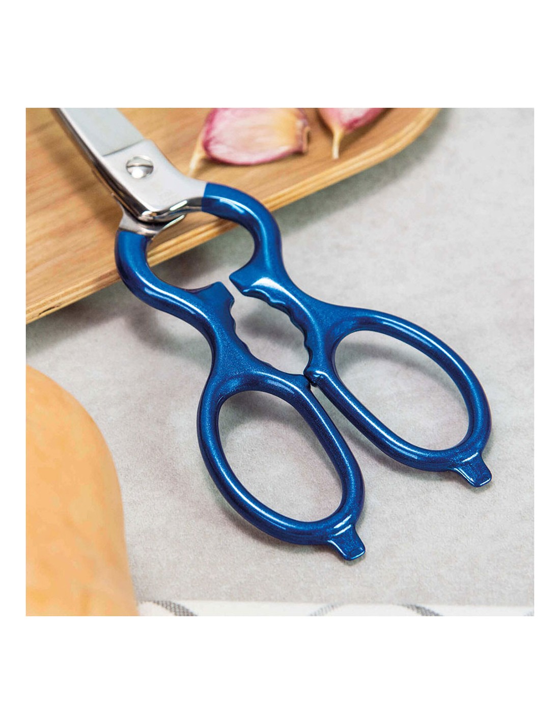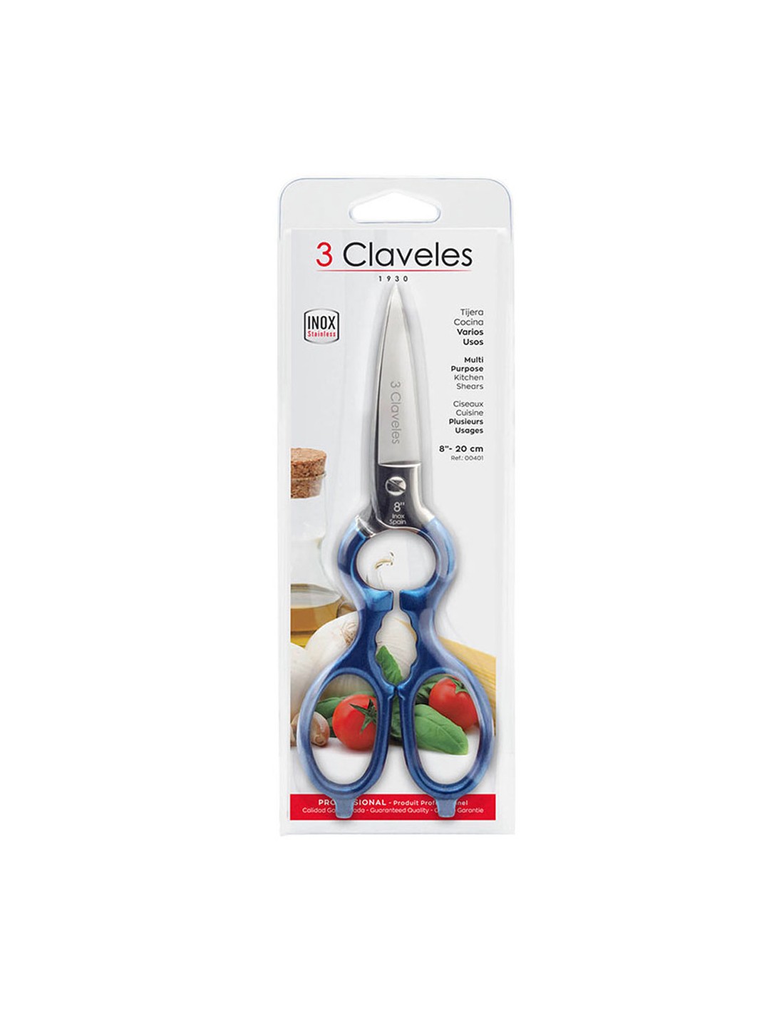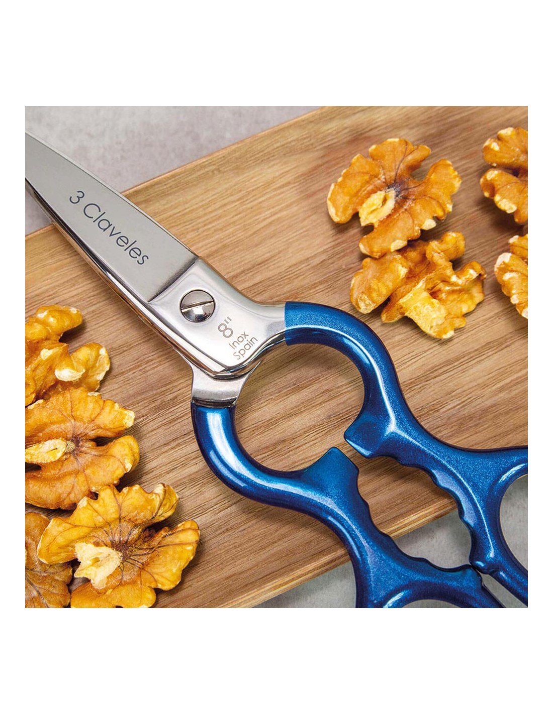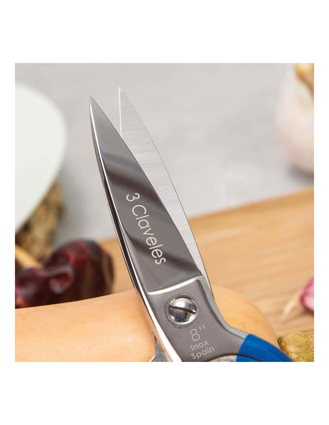 Tijera forjada inox forjada en caliente, ligera y comoda. medida 8" . dedales esmaltados en azul sin bpa. presentada en display colgador. varios usos de la tijera: corte , casca nueces, abre botes y descapsulador. filo dentado para fijar alimentos al ser cortados , así como para separar articulaciones y huesos finos. se puede lavar a mano o en el lavavajillas