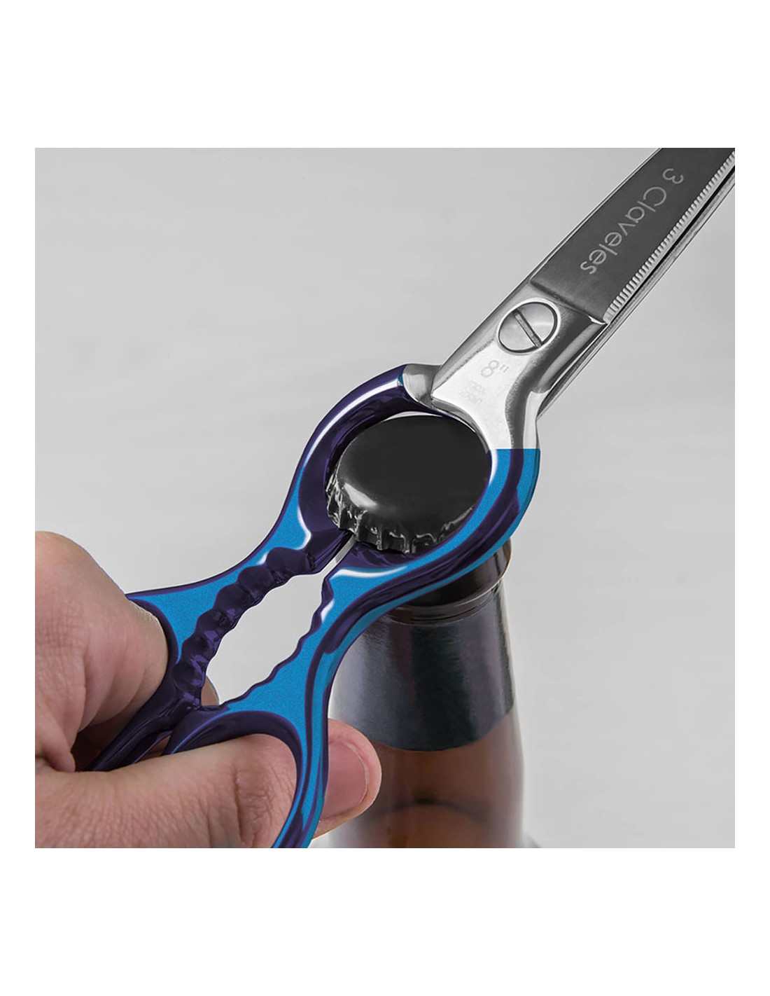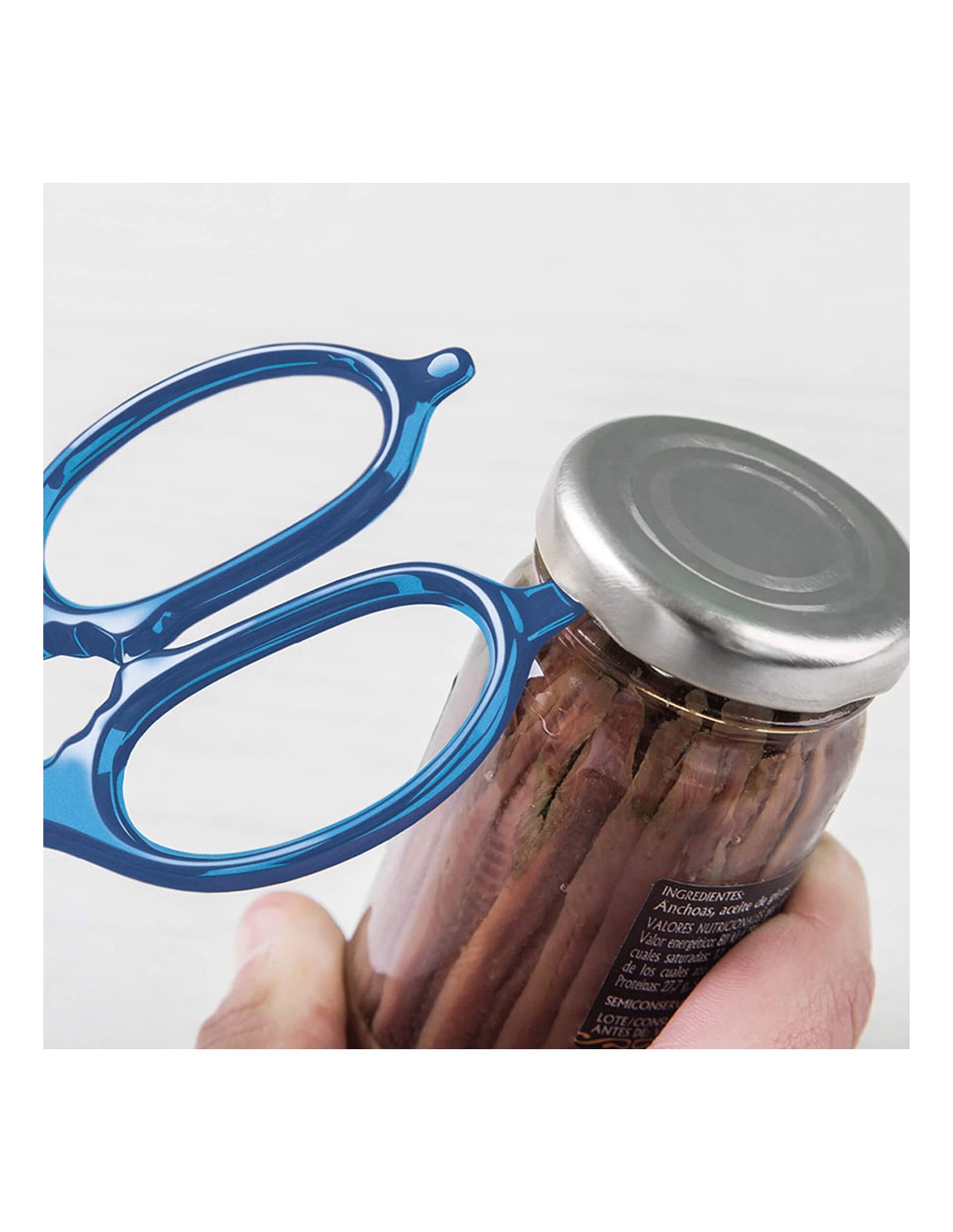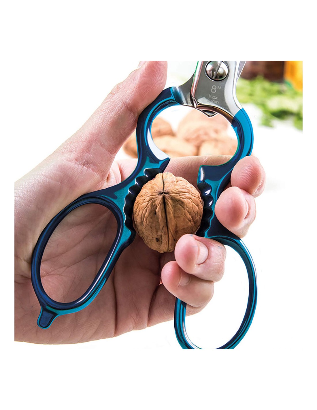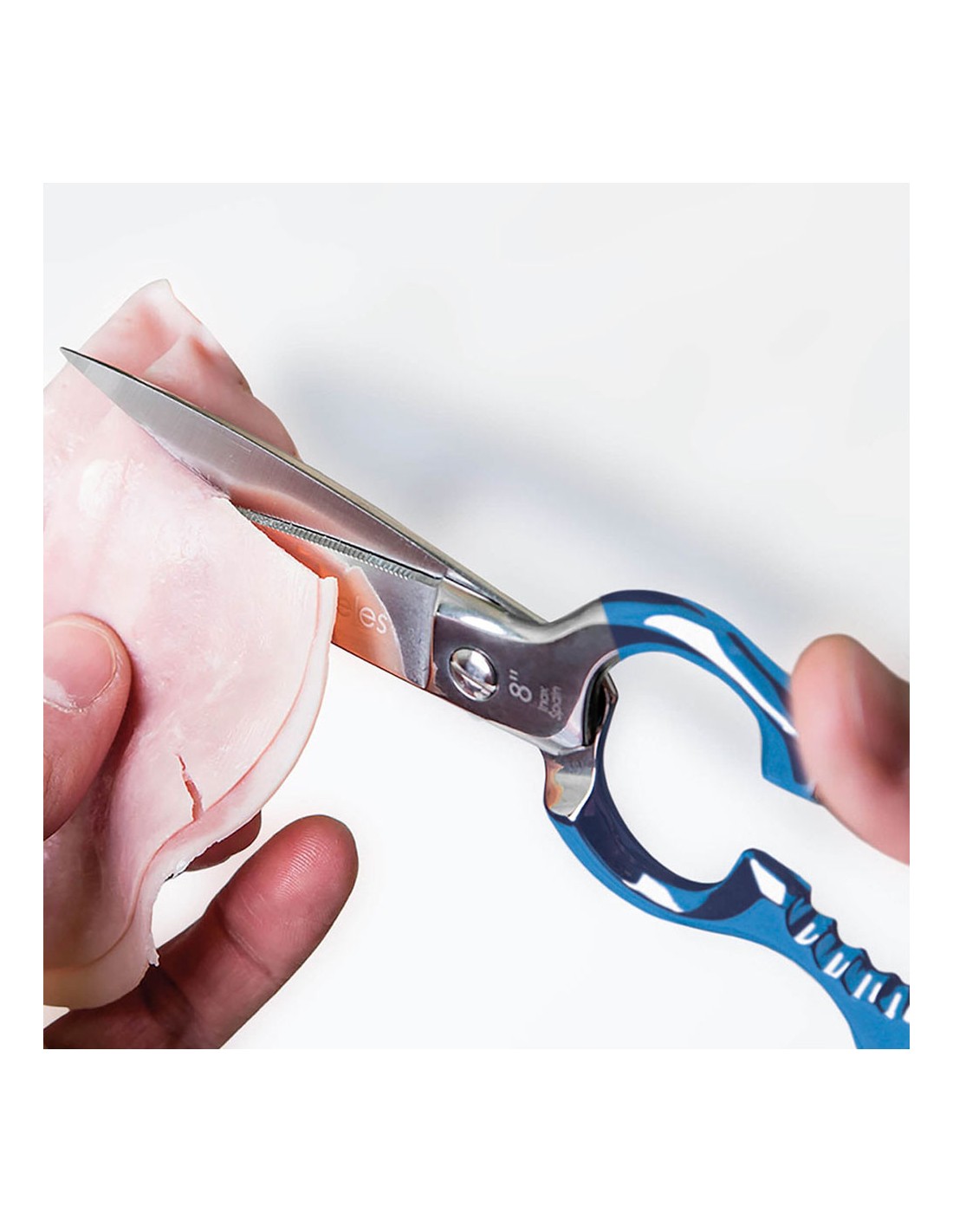 Tijera forjada inox forjada en caliente, ligera y comoda. medida 8" . dedales esmaltados en azul sin bpa. presentada en display colgador. varios usos de la tijera: corte , casca nueces, abre botes y descapsulador. filo dentado para fijar alimentos al ser cortados , así como para separar articulaciones y huesos finos. se puede lavar a mano o en el lavavajillas