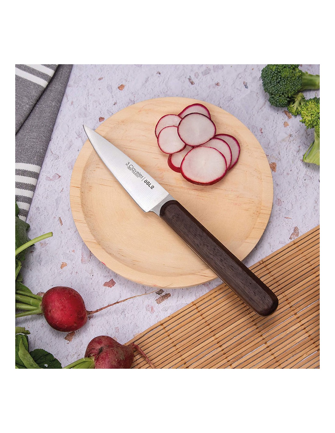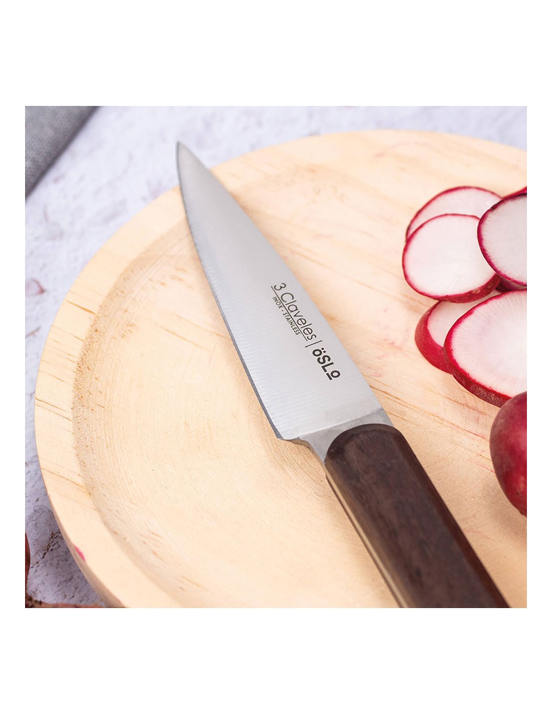 El cuchillo de verduras oslo corta , pela , limpia pequeñas frutas o verduras. destaca por el corfort y calidez de la madera de nogal en su mango de lineas redondeadas y sin remaches. hoja de acero inox de 9 cm . mango madera de nogal. no recomendable para lavavajillas. presentado en display/colgador