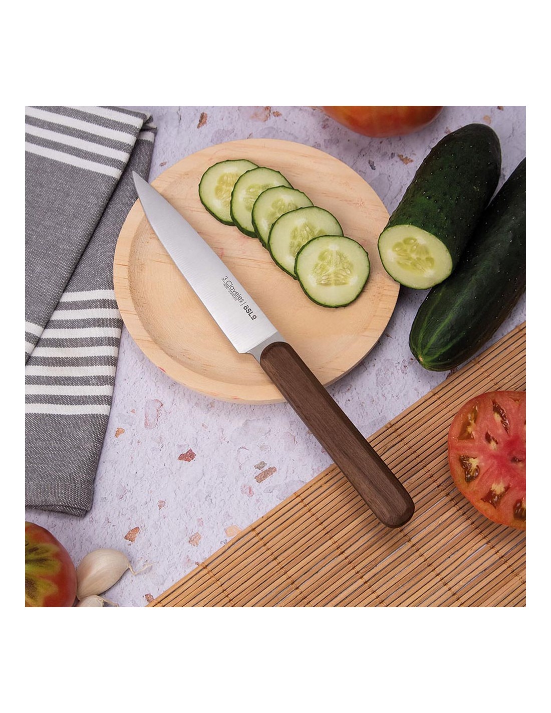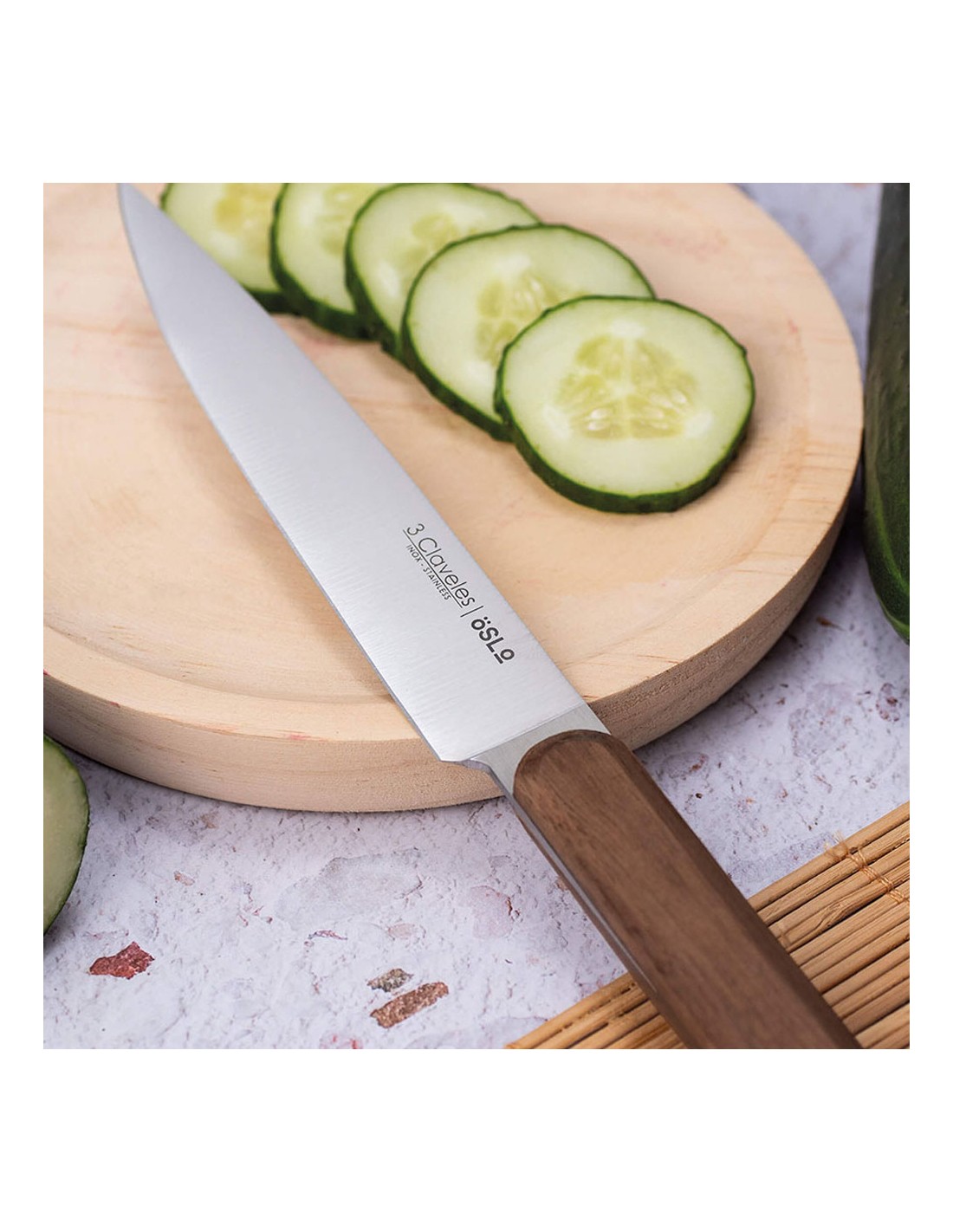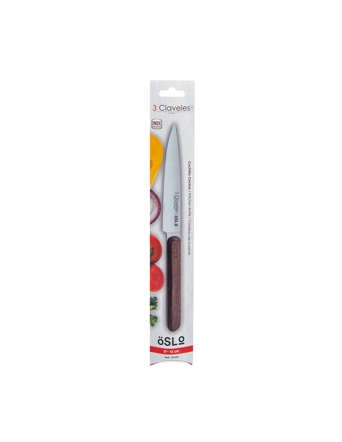 El cuchillo de cocina oslo de 130 mm es un cuchillo perfecto para el corte, limpieza y picado de verduras. destaca por el corfort y calidez de la madera de nogal en su mango de lineas redondeadas y sin remaches. no recomendable para lavavajillas. presentado en display/colgador