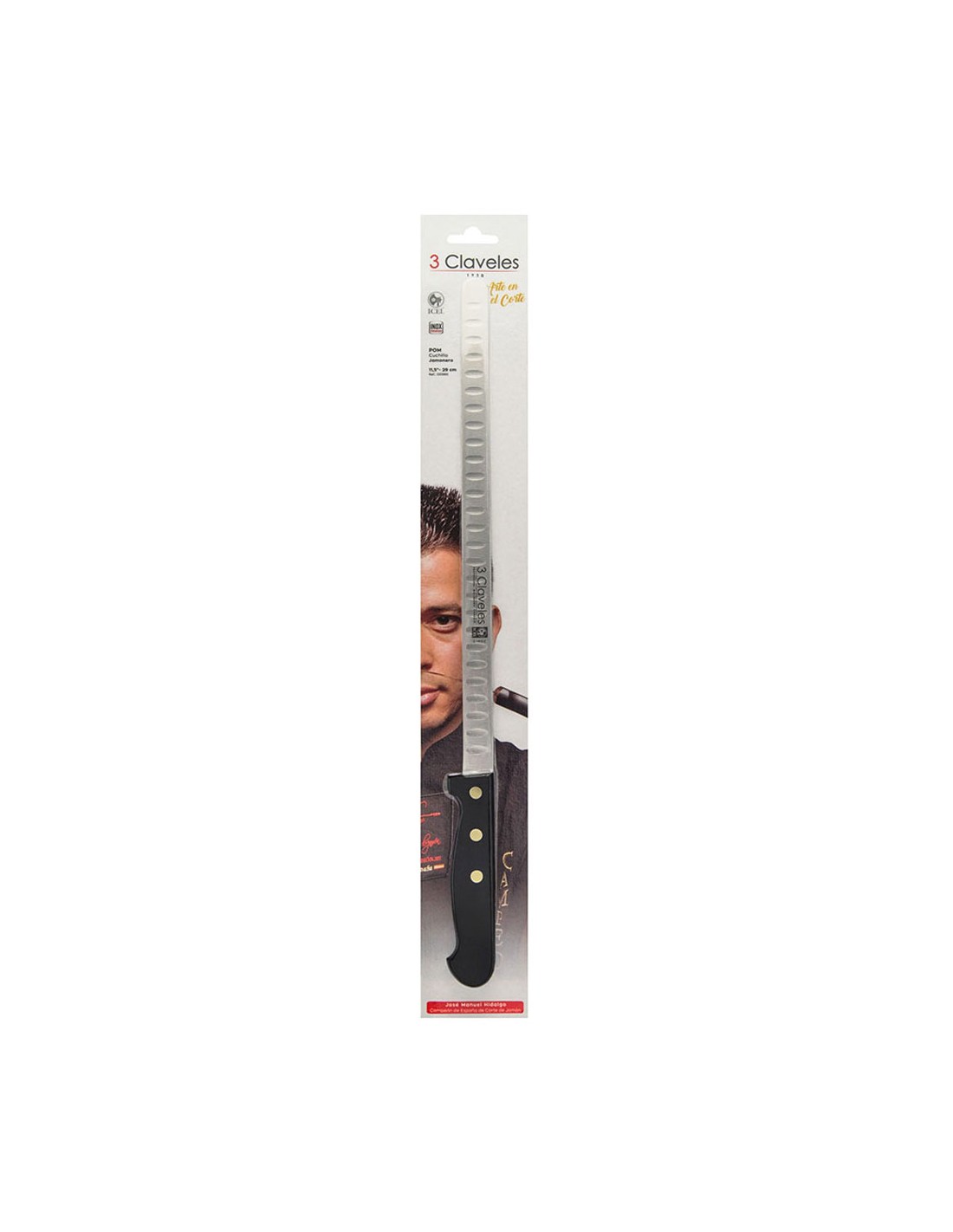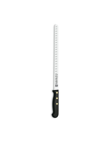 Cuchillo jamonero 29 cm de hoja alveolada y flexible, que permite conseguir lonchas finas para una mejor degustación y aprovechamiento del jamon. la hoja alveolada permite que la loncha no se quede adherida al cuchillo. fabricado en acero inox y con mango pom. presentado en display/colgador