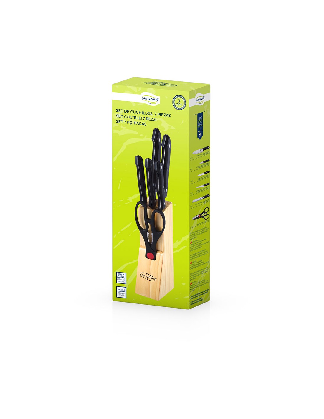 Juego de cuchillos 7 piezas acero inox dresde + tacoma. contiene: cuchillo de chef 33,3 x 3,3 x 1,5 cm. cuchillo de pan 32,6 x 3,3 x 1,5 cm. cuchillo de deshuesar 25,2 x 2,3 x 1,3 cm. cuchillo multiusos 23,6 x 2.3 x 1,3 cm. cuchillo de pelar 18,8 x 2,3 x 1,3 cm tijeras 21,4 cm x 7,77 x 1,2 cm. bloque de madera 6,1 x 10,5 x 20,7 cm