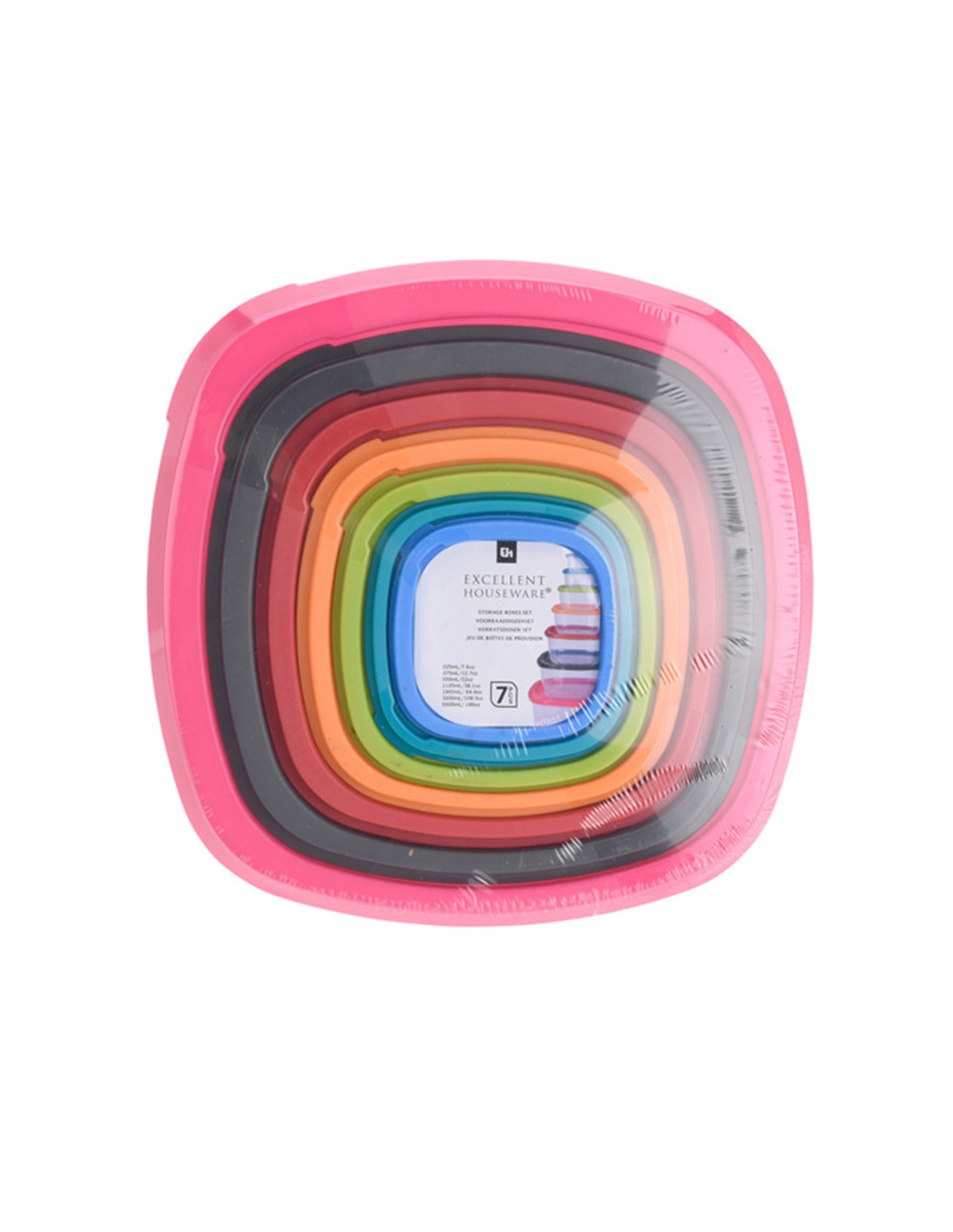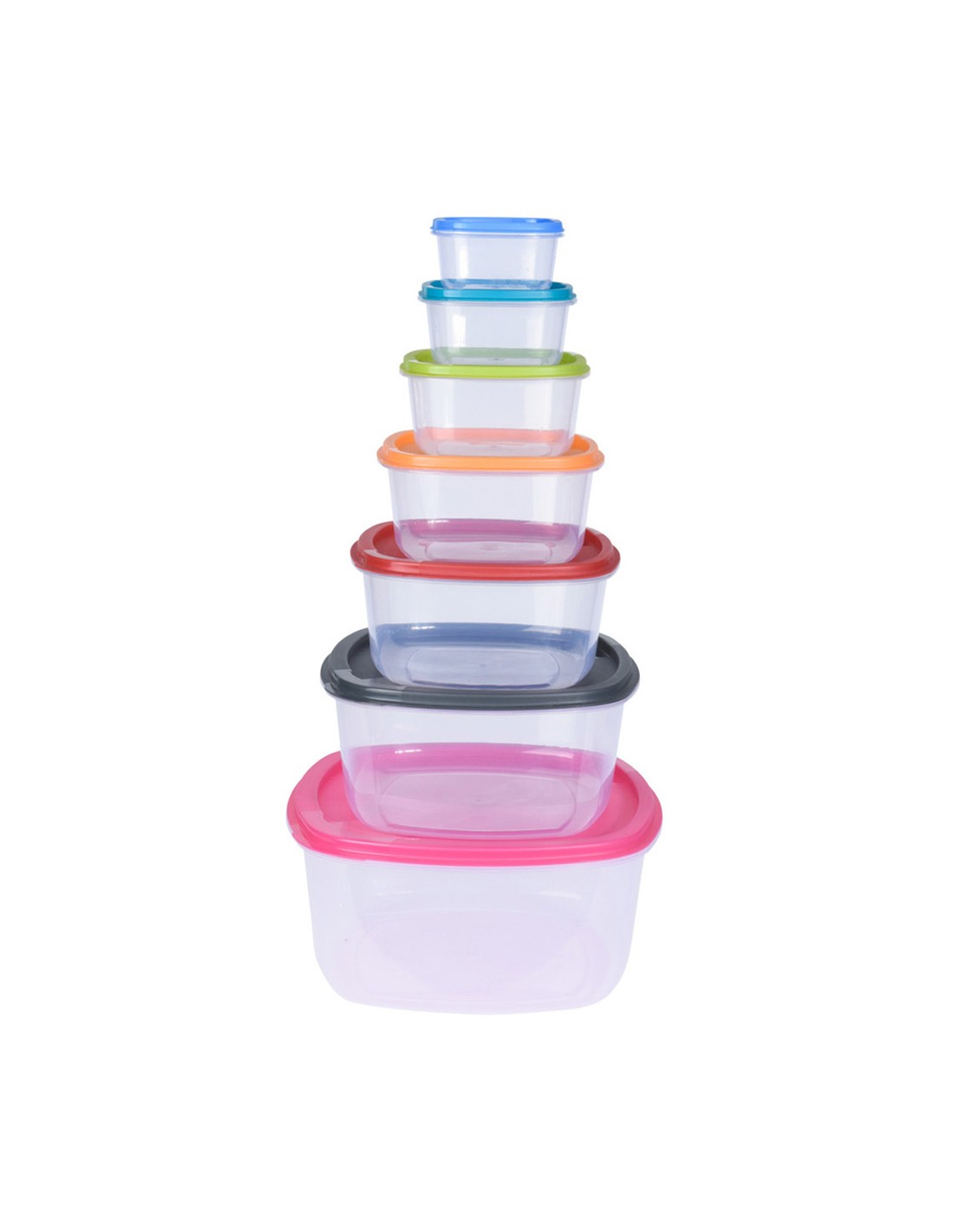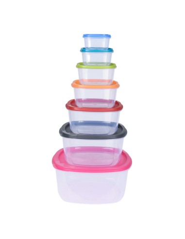 Set 7 fiambreras de plástico, tapa de colores, capacidad: 225 ml, 375 ml, 650 ml, 1125 ml, 1900 ml, 3200 ml, 5500 ml, apto para microondas máx. 5 min. 850 w 120 °c lavavajillas y congelador, no apto para horno