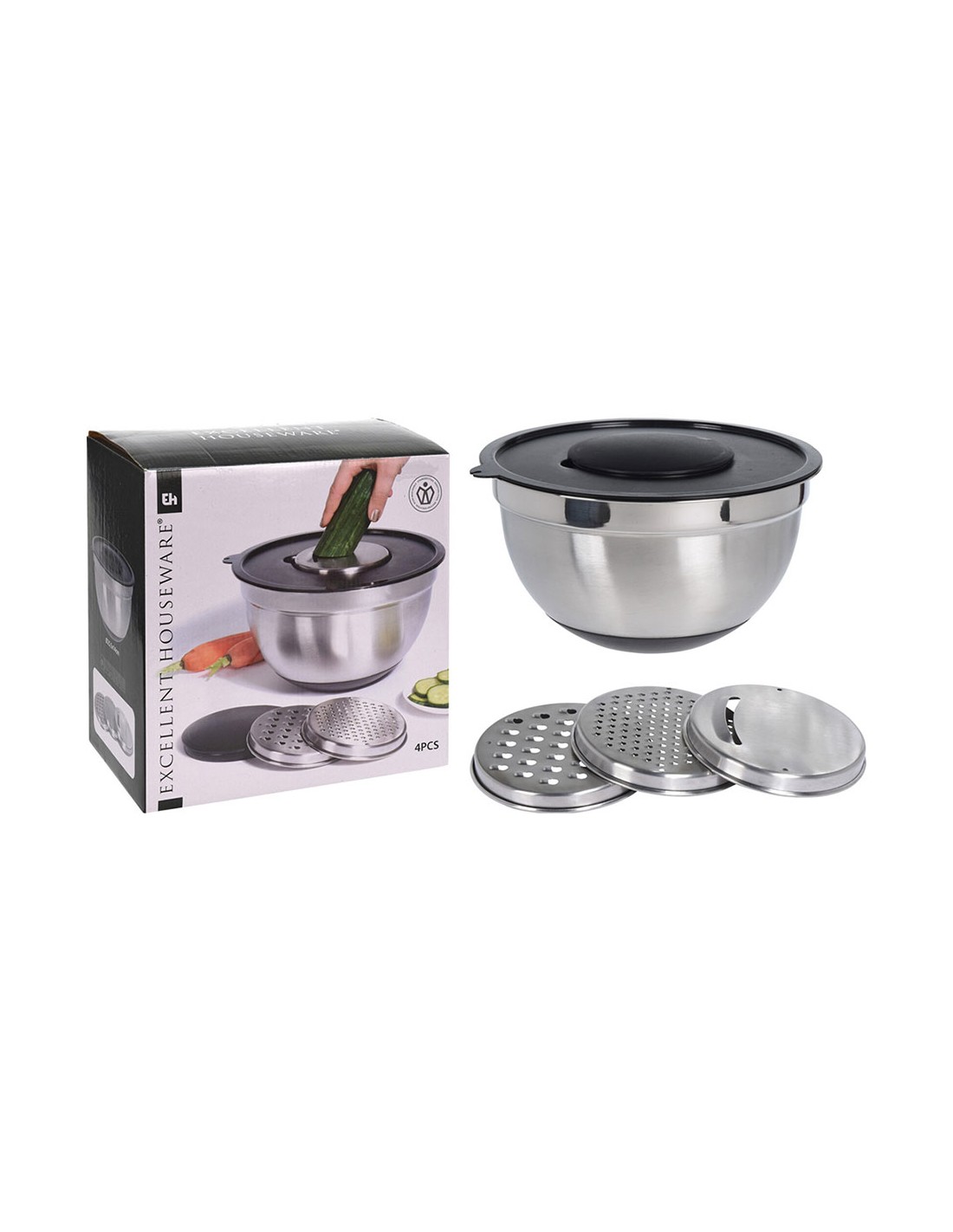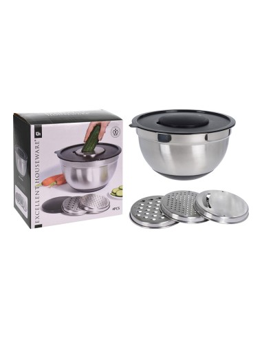 Ensaladera + 3 ralladores de acero inoxidable, parte inferior antideslizante, tapa de plástico, 25x25x14cm, apto para lavavajillas. a12405340. excellent houseware