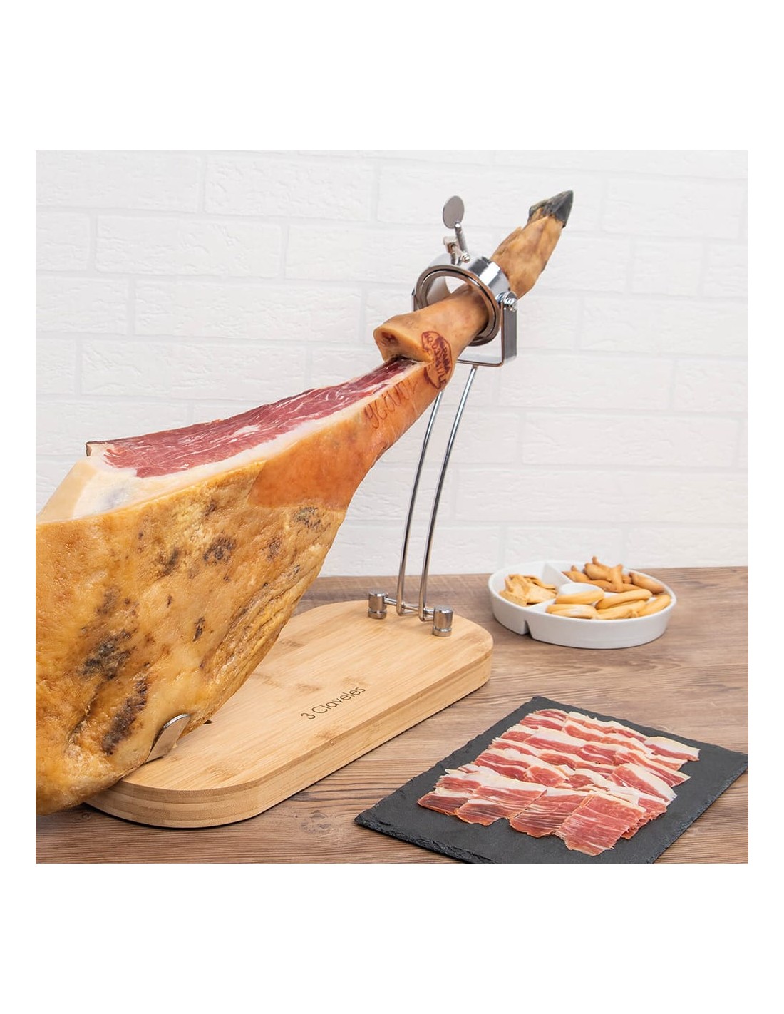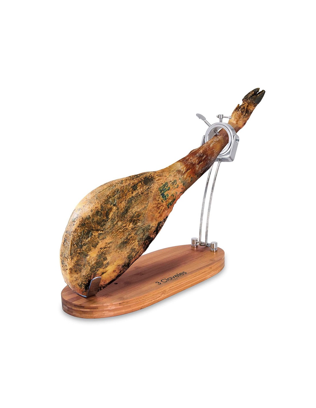 Soporte jamonero plegable y giratorio 360°. dos posiciones en la base para sujección del jamón . base de bambú con topes antideslizantes para una mayor estabilidad. plegado fácil, reduciendo el espacio de almacenaje. fácil limpieza. medidas: 47 x 18,5 x 37 cm