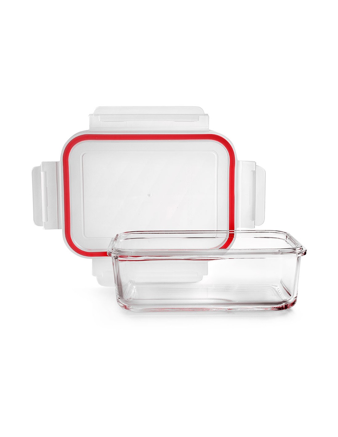 Fiambrera rectangular de borosilicato, capacidad:400 ml, juntas de cierre de silicona, temperatura máxima 450°c y mínima de -40°c, medidas: 10 x 15 x 5 cm