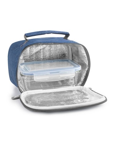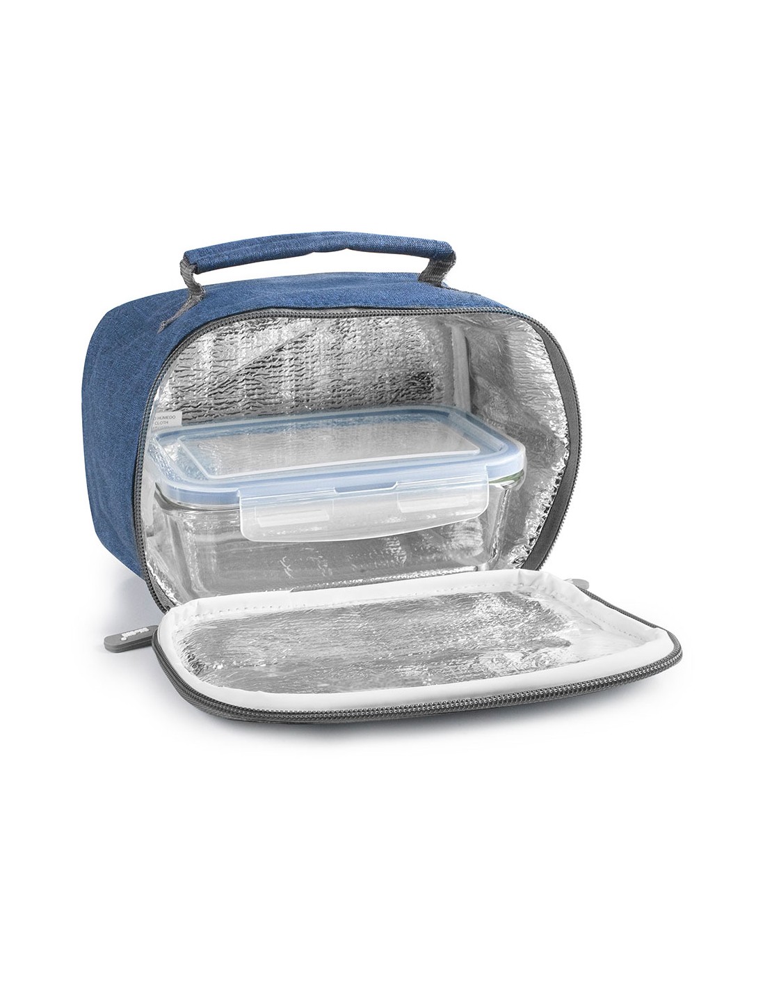 Porta alimentos azul de poliéster + fiambrera de borosilicato, medidas: 21 x 13 x 14 cm, taper 18,5 x 13,3 x 6,5 cm, 850 ml