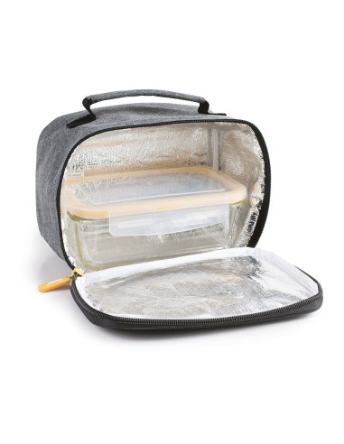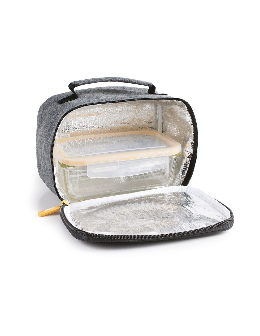 Porta alimentos gris de poliéster + fiambrera de borosilicato, medidas: 21 x 13 x 14 cm, taper 18,5 x 13,3 x 6,5 cm, 850 ml