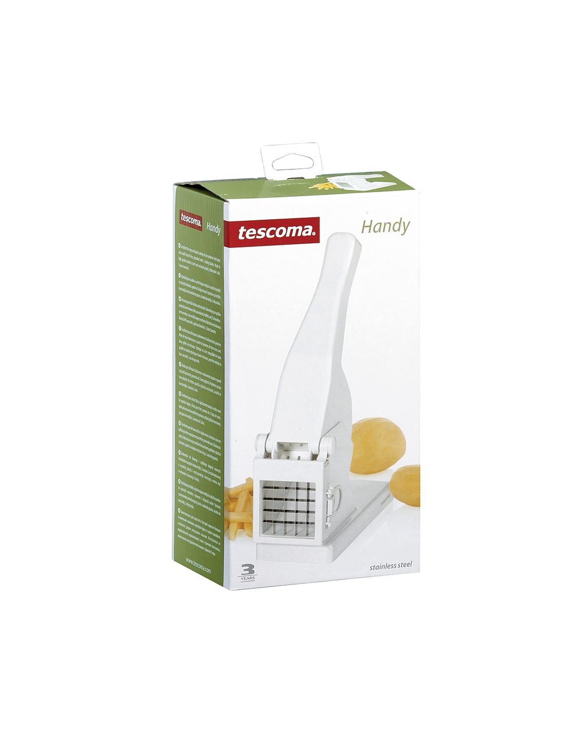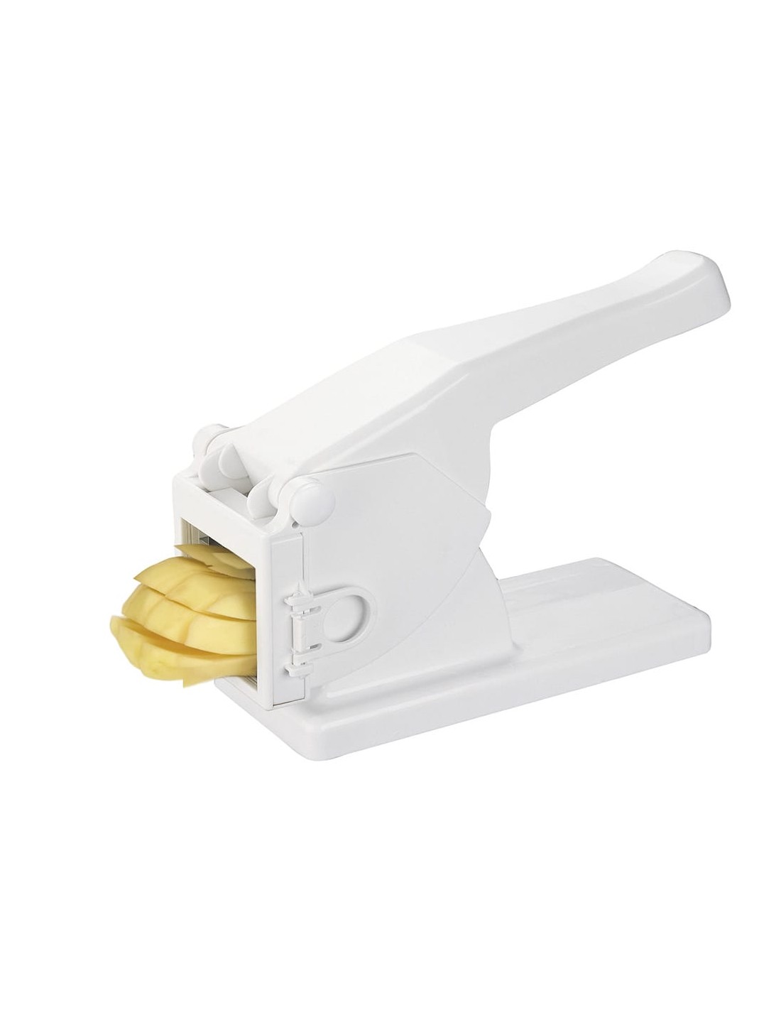 Cortador de patatas handy. las partes de metal están fabricadas en acero inoxidable. corta las patatas en 2 tamaños distintos. la hoja de corte se reemplaza fácil y rápidamente. guarda de forma segura la hoja sobrante. se lava y limpia con facilidad