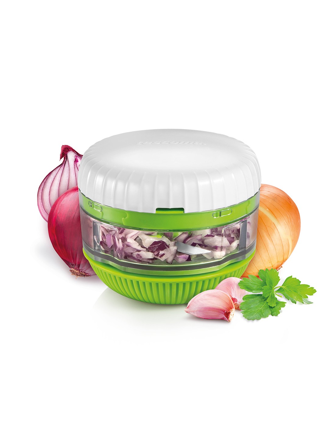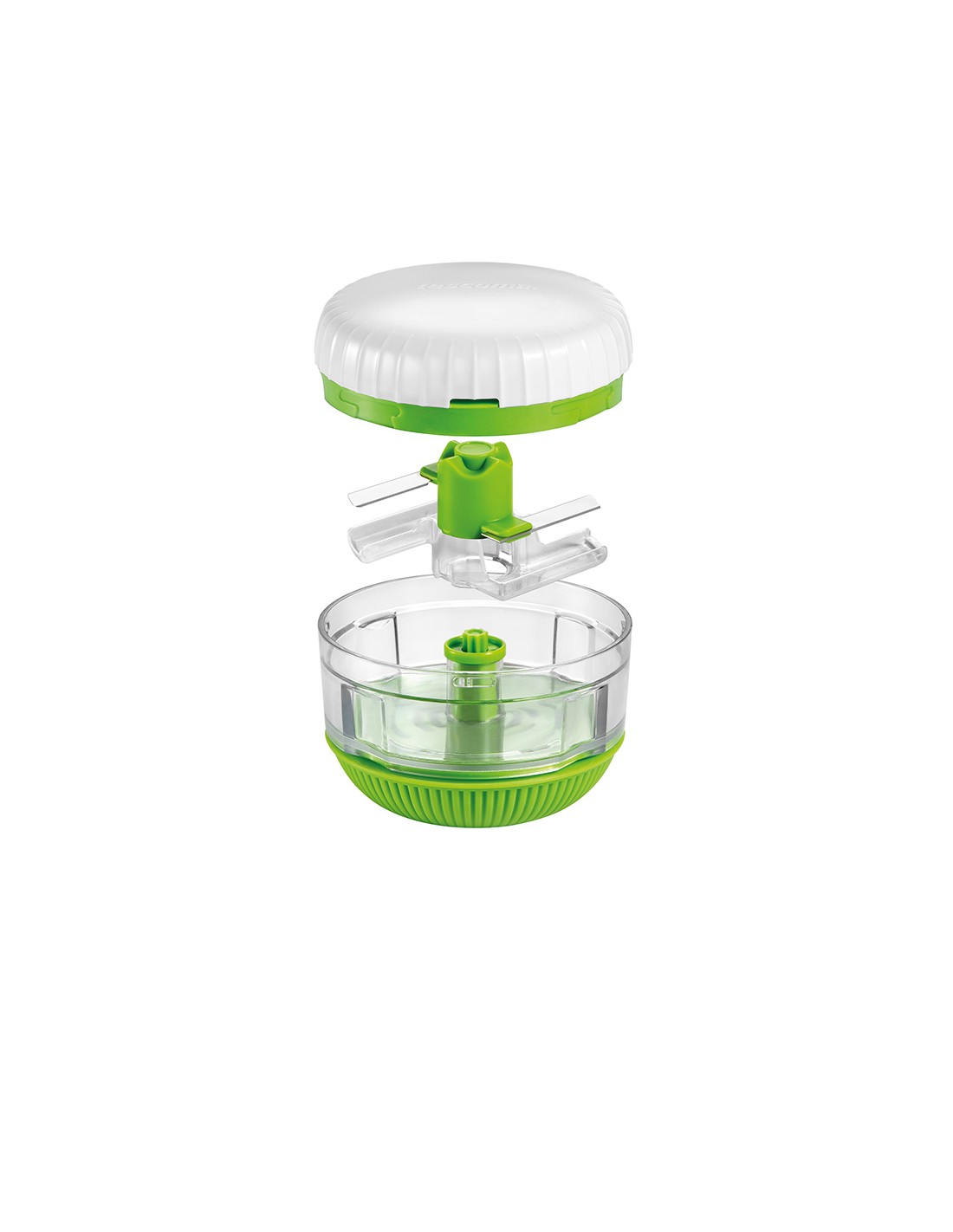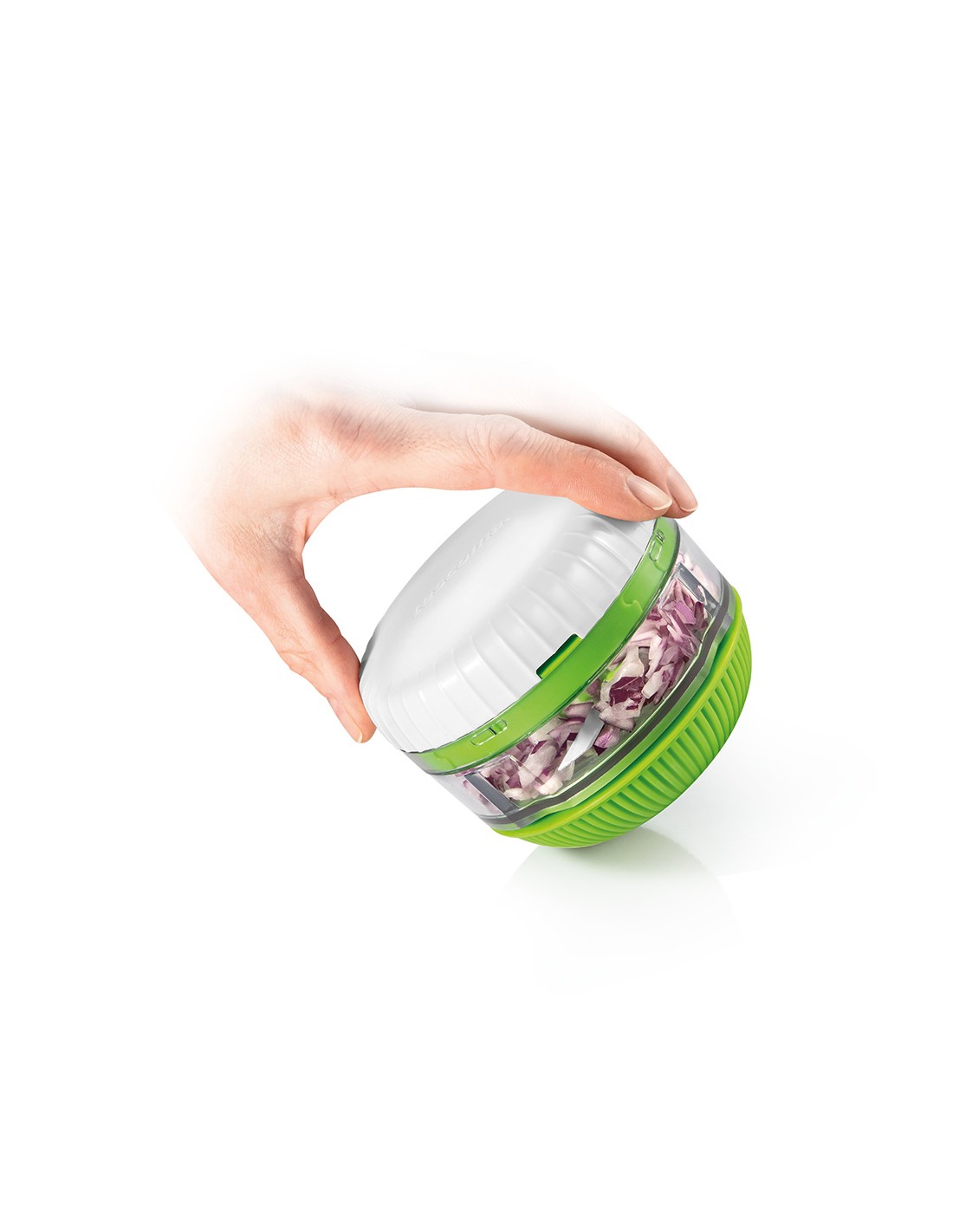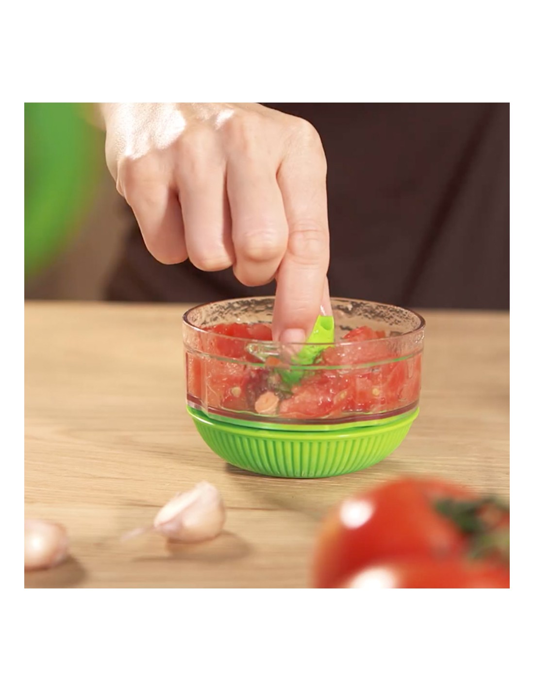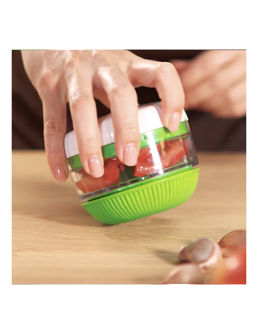 Picadora giratoria handy. pica fácil y rápidamente los alimentos al tamaño deseado. excelente para hierbas, ajos, cebollas, etc. fabricada de plástico resistente con tratamiento antideslizante, cuchillas de acero inoxidable de alta calidad