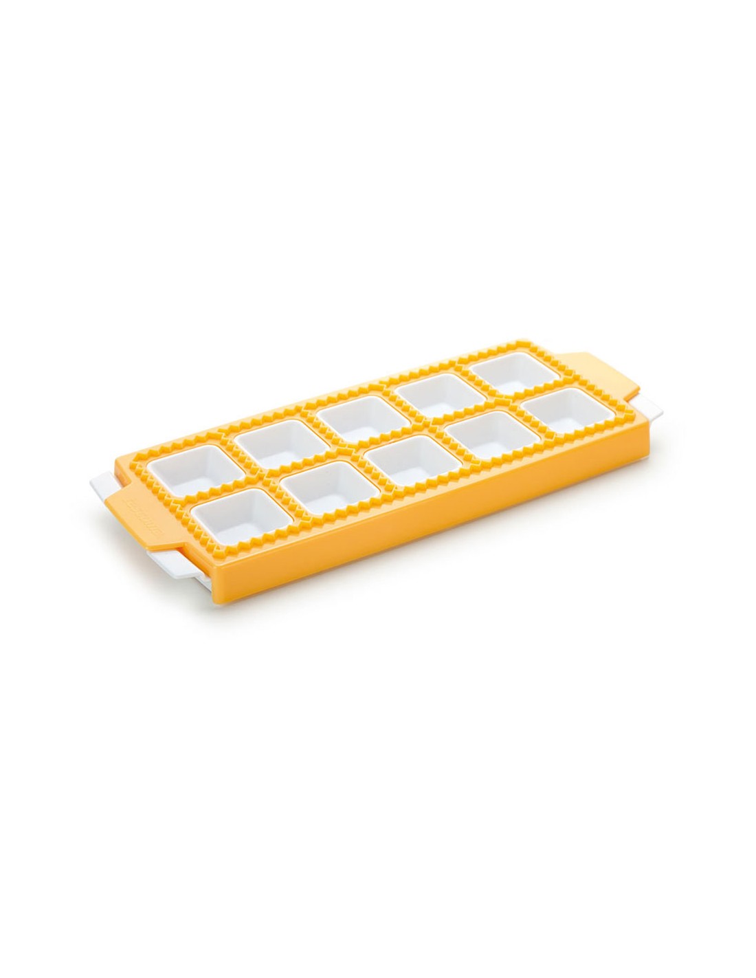 Molde para preparar ravioli. poner un cuadrado de masa en el molde, distribuir el relleno, cubrir con otra capa de masa cuadrada y preparar raviolis utilizando varios trazados del rodillo. con tratamiento antiadherente, fabricado de plástico apto para lavavajillas, contiene libro de recetas