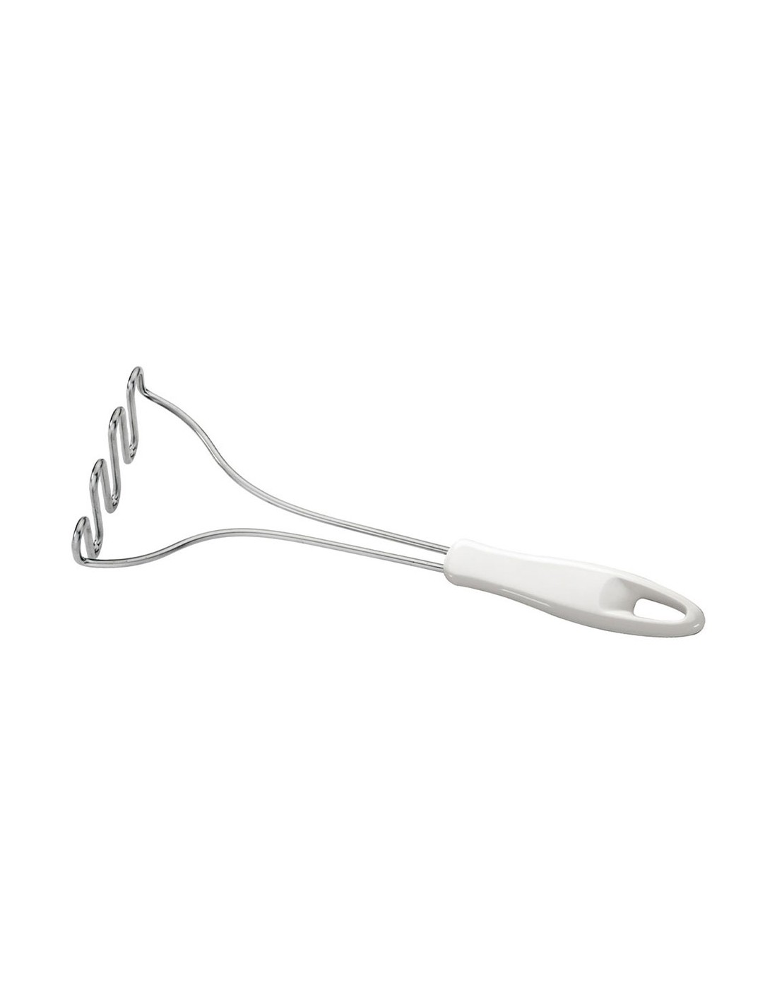 Aplastapatata, de color blanco. fabricado en acero inoxidable y plástico