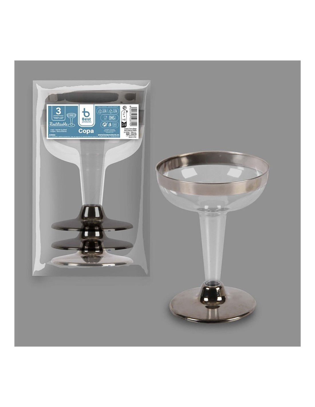 Copa baja reutilizable, 3 unidades. base / borde superior color plata. capacidad 100 cc. medidas boca: ø8,5 cm x altura: 11 cm x pie: 6,7 cm. material plástico
