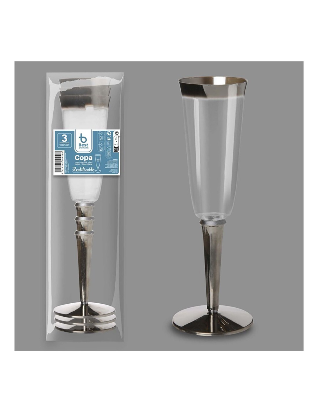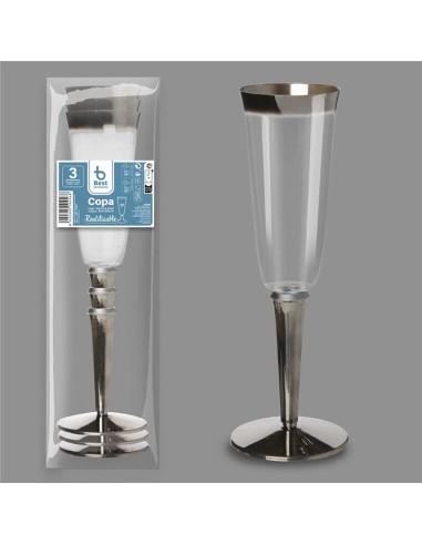 Copa para cava reutilizable, 3 unidades. base / borde superior color plata. capacidad 180 cc. medidas boca: ø5,8 cm x altura: 20,5 cm x pie: 7 cm. material plástico