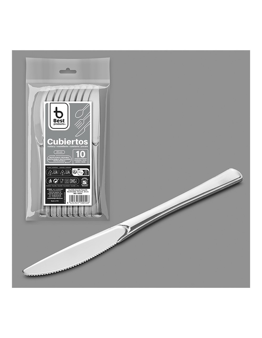 Cuchillo reutilizable, 10 unidades. 20 cm, color plata. material plástico
