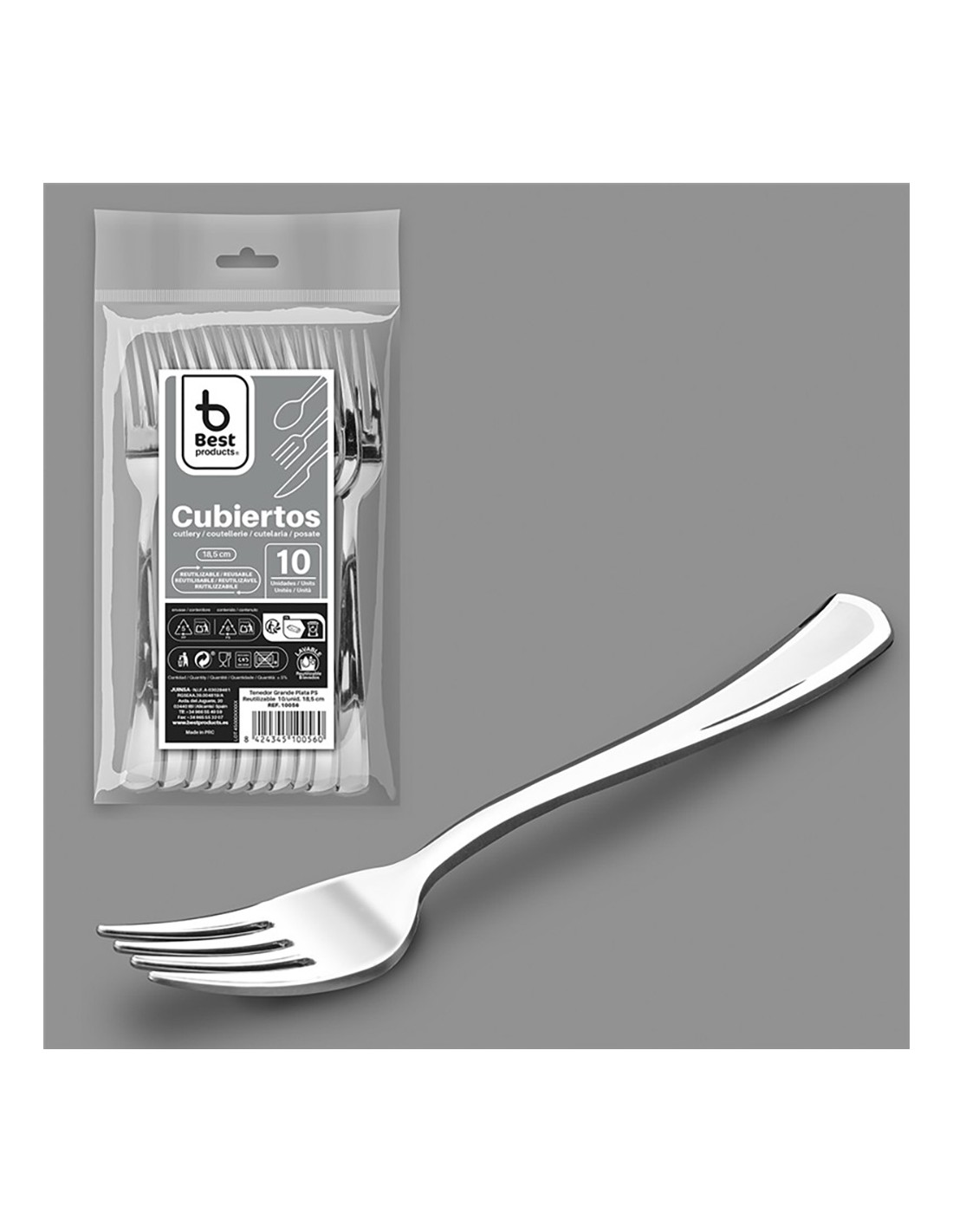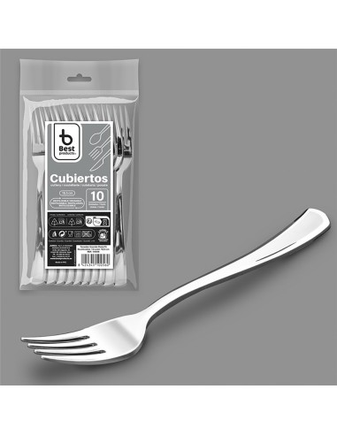 Tenedor reutilizable, 10 unidades. 18,5 cm, color plata. material plástico